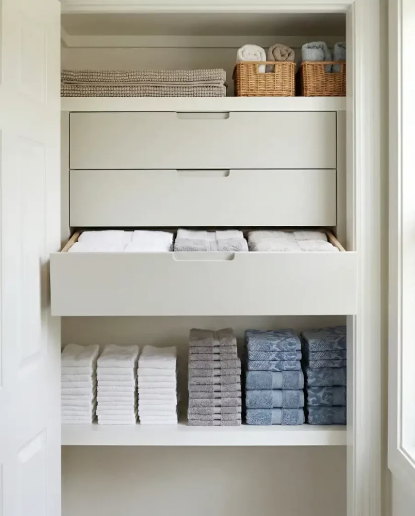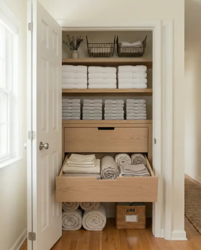 Installing pull-out drawers inside a linen closet creates hidden compartments for sheets, pillowcases, and seasonal bedding. This style suits modern homes that prefer sleek, enclosed storage instead of open shelving.