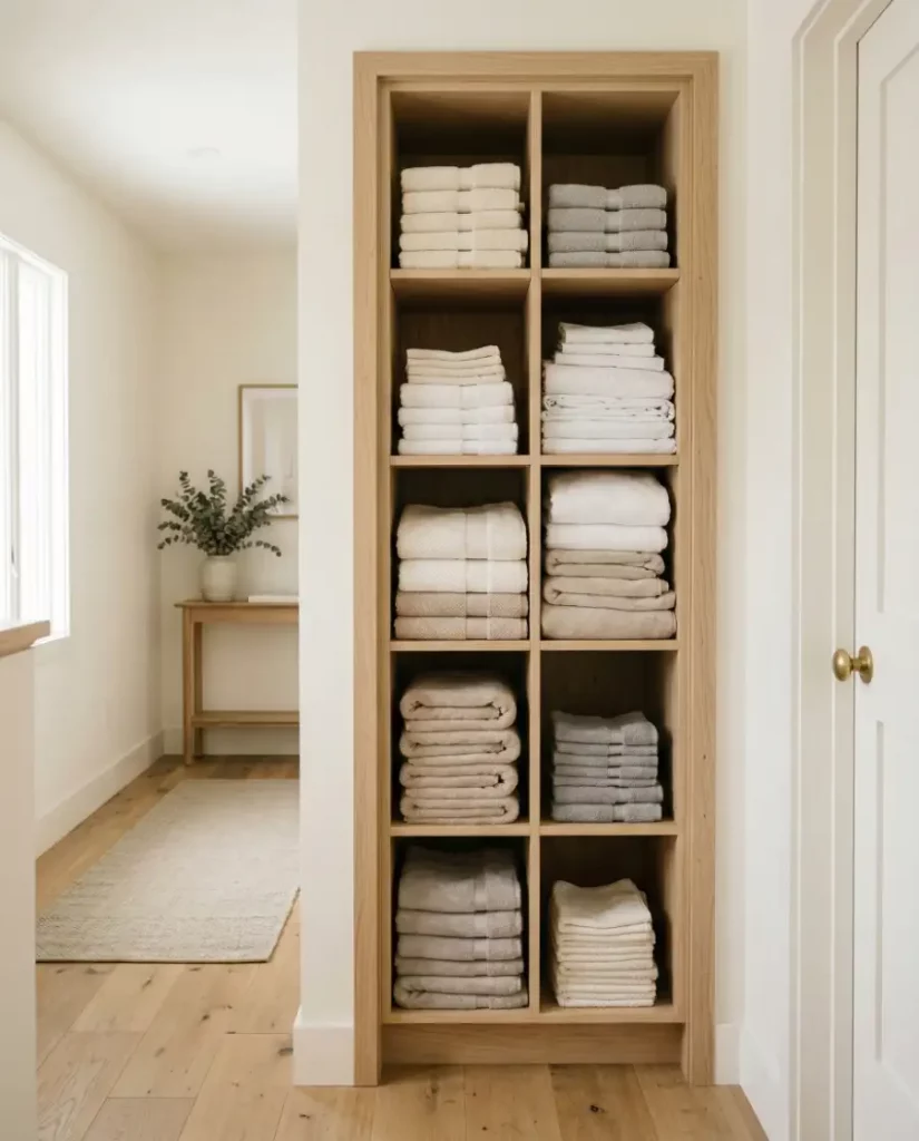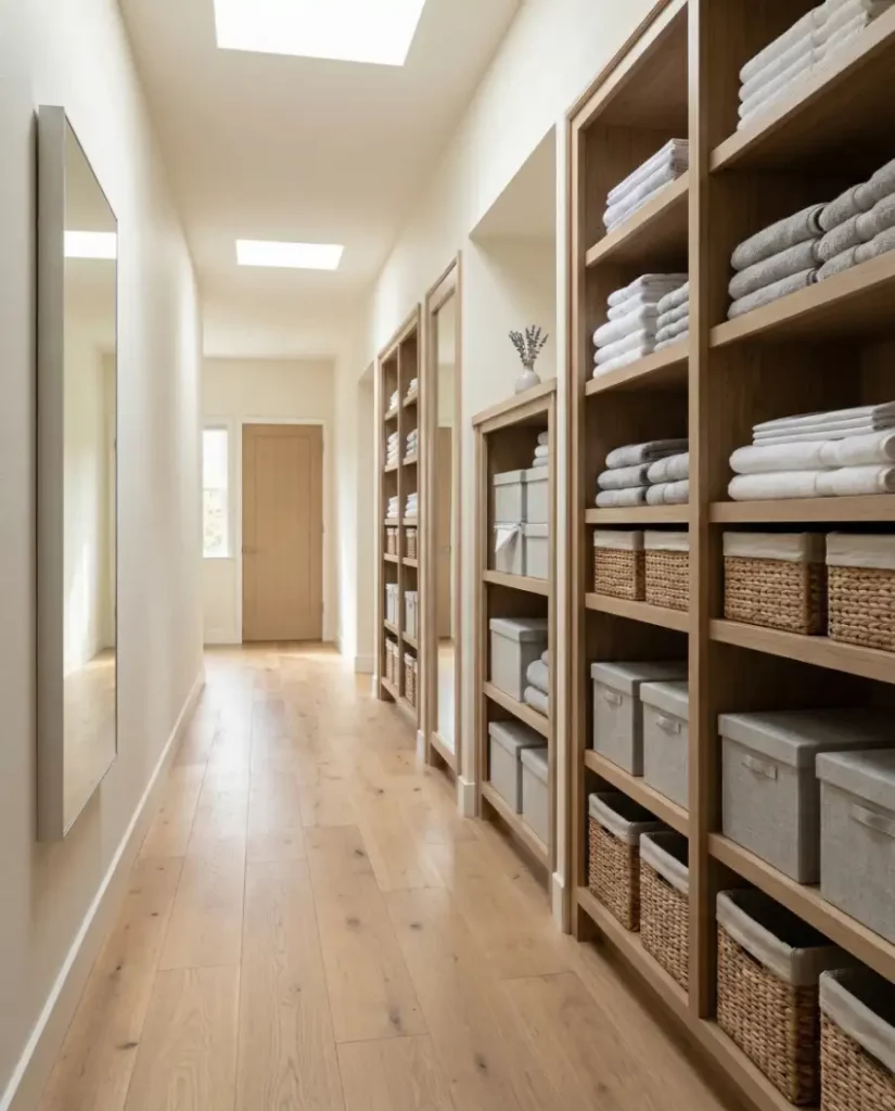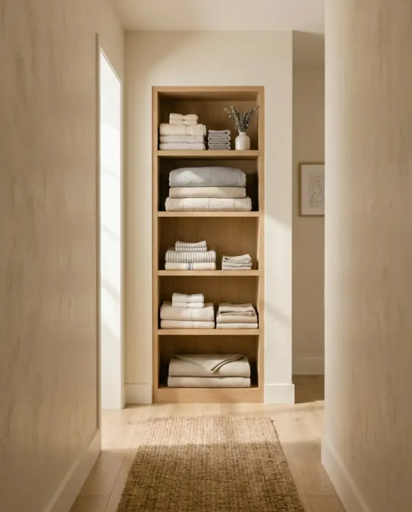 Architectural wall niches can become beautiful linen storage when installed along hallways. These recessed shelves keep folded towels and linens visible while maintaining a streamlined modern look. In narrow homes or apartments, built-in niches act like mini closets without taking up valuable floor space.