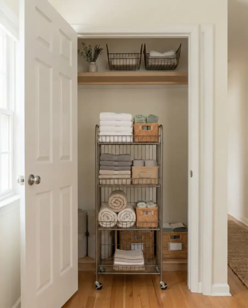Slim rolling carts fit neatly into narrow gaps beside closets or inside unused corners. These mobile units are perfect for storing towels, extra linens, and toiletries in compact small spaces. Because they slide out easily, even deeper areas of a closet become accessible without rearranging stacks.