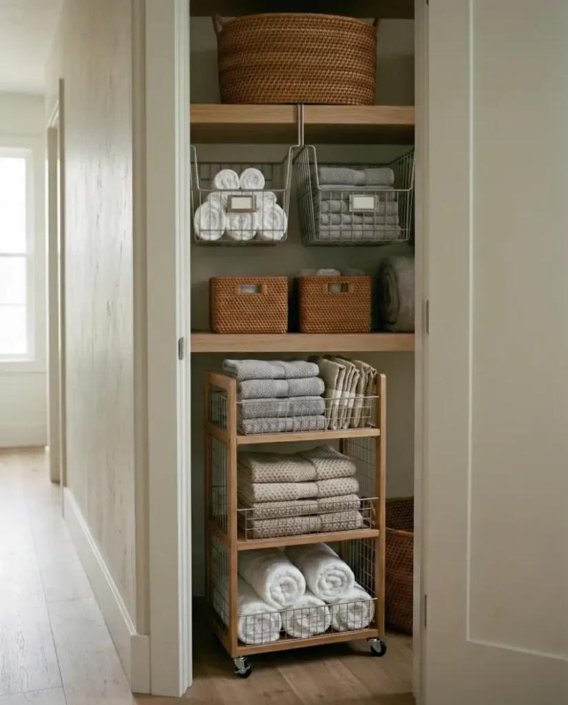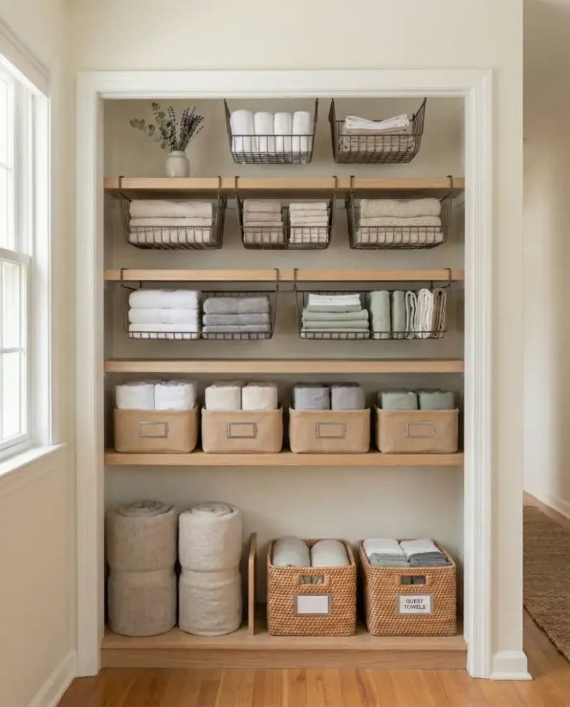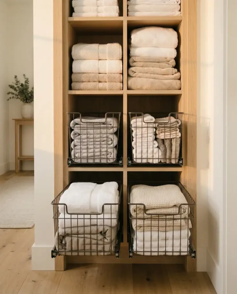 Adding sliding wire baskets inside a linen closet instantly improves visibility and organization. Instead of digging through piles, linens can be sorted into categories such as towels, pillowcases, or blankets. This type of small spaces storage solutions is especially useful when shelves are deep and items tend to disappear in the back.
