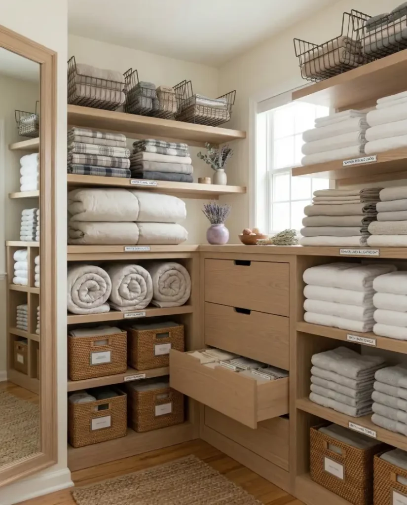 20. Seasonal Linen Rotation Shelves