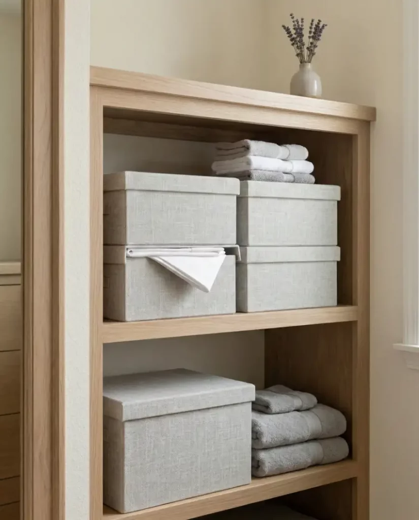 Stackable boxes are a smart solution for organizing linens in small spaces. Clear or fabric containers keep sheet sets, towels, and spare pillowcases grouped together while maximizing vertical storage. In a small hallway closet, stacking boxes creates a tidy layered system that prevents shelves from becoming overcrowded.