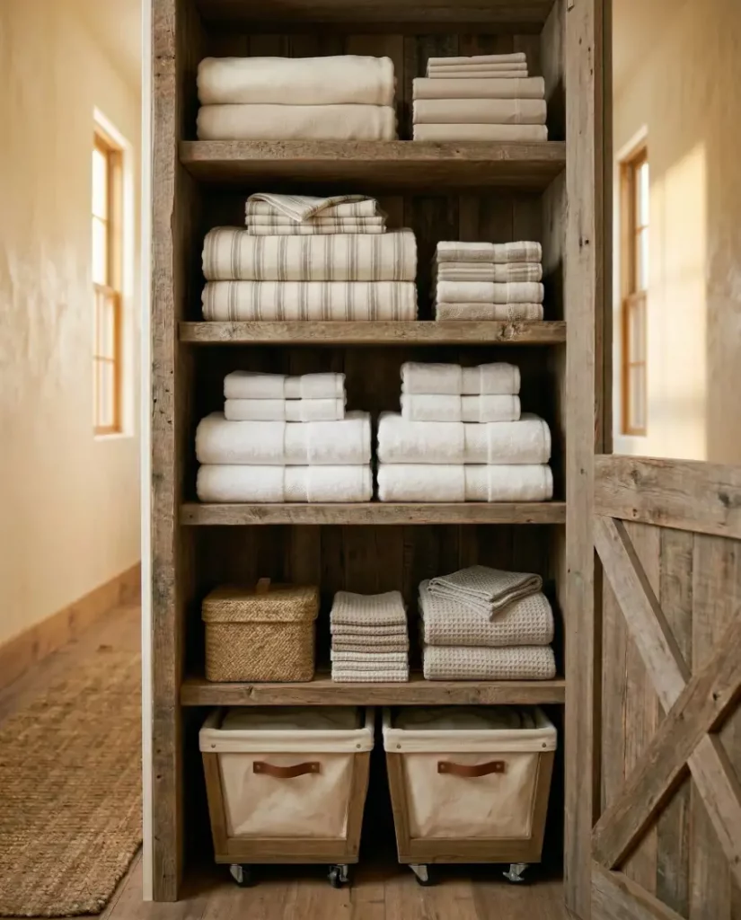 A cozy farmhouse linen closet often combines open shelves with natural textures like woven baskets. This style works beautifully in homes with rustic touches or warm wood finishes. Baskets help group towels and blankets while keeping shelves tidy, making them perfect for relaxed family shared spaces.