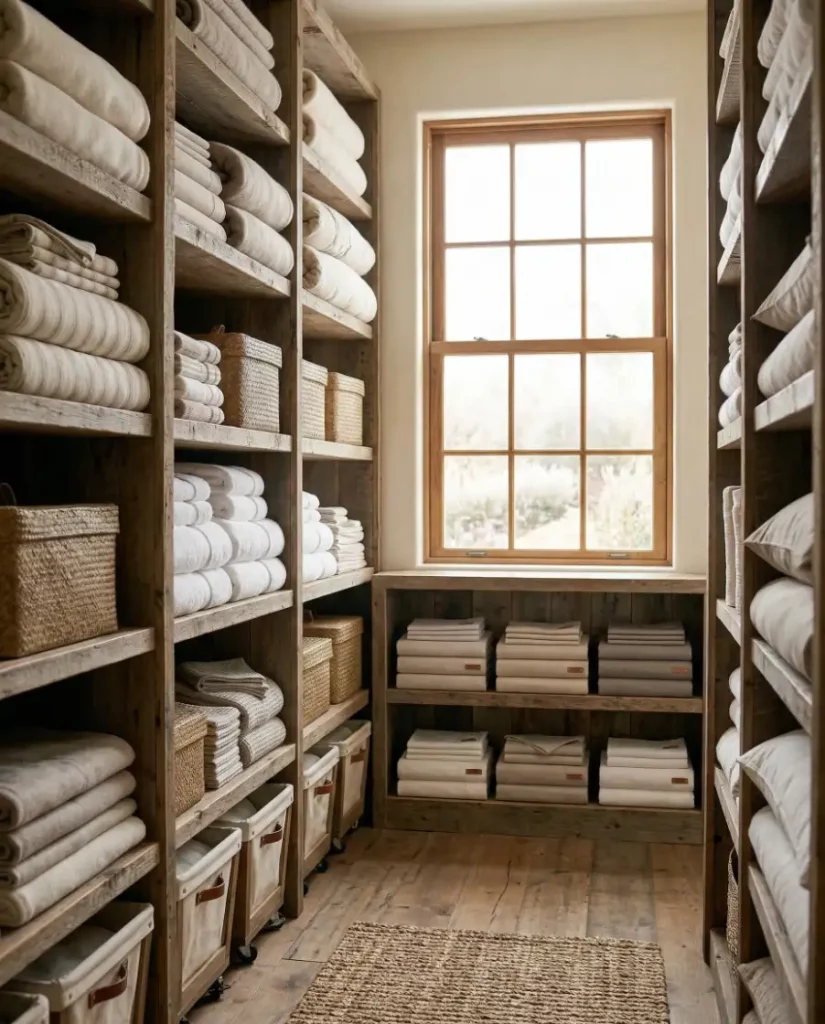 In larger homes, a walk in linen closet can function almost like a mini storage room. Adjustable shelves hold everything from spare pillows to bulky comforters, while deeper shelves store extra bathroom towels and seasonal bedding.