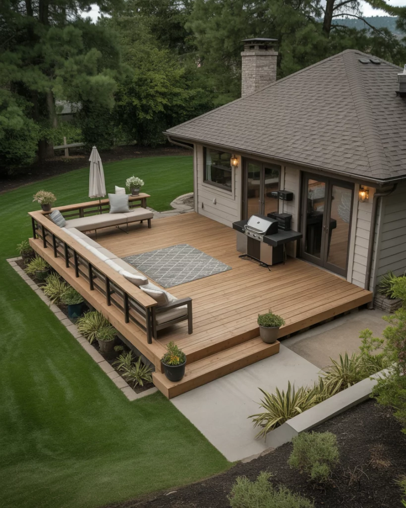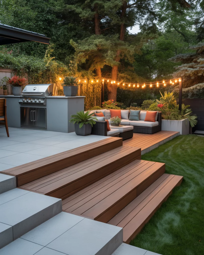 A multi-level deck injects shape and style into a backyard. By raising certain portions, it naturally separates dining, lounging, or the grill. Concrete or wood are used for visual contrast, and the steps serve as additional casual seating. With this particular design to complement sloping yards, it turns a challenge into a rewarding solution. Multi-level decks also capitalize on views, making even a very small yard feel luxurious.