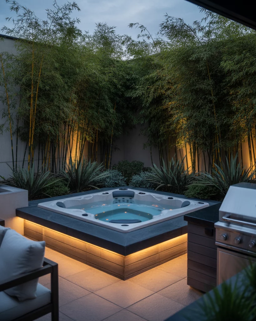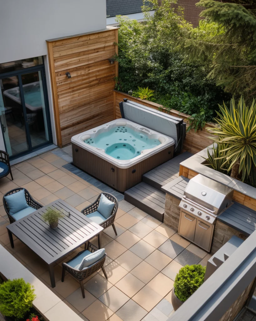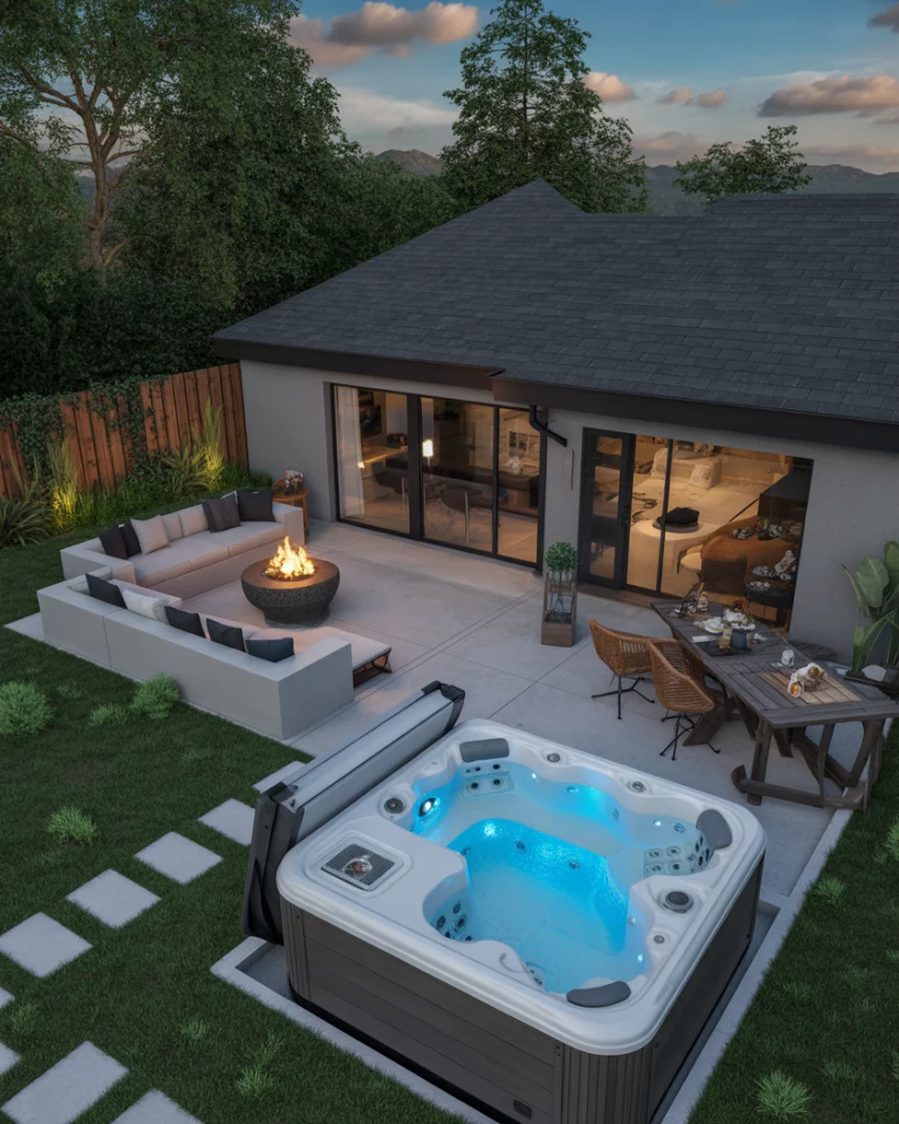 One of the most exciting with hot tub trends is pairing it with a nearby grill area. This creates a lively entertaining space where relaxation and dining merge. Imagine friends enjoying the hot tub and grill while others gather around a fire pit—a true social hub. A thoughtful layout keeps everything close yet safe, with durable concrete or pavers underfoot. This combination reflects how backyards are becoming all-in-one retreats.