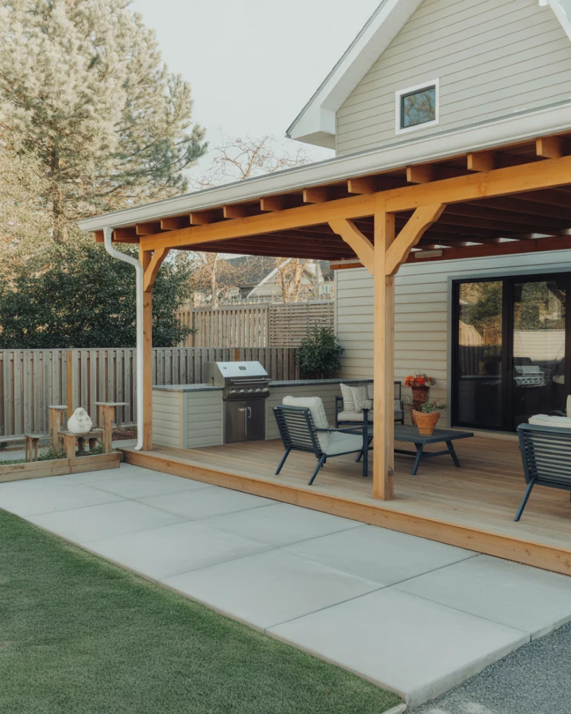 Designing patios currently growing in popularity as safe play areas for children. Durable concrete or smooth pavers make for easy-to-clean surfaces, and the deck can be covered to allow shady moments. Families tend to keep the grilling area separate from the play zone for safety reasons. That makes it ideal for the smaller yards too, blending functionality with fun. The family-friendly approach proves that style and practicality can coexist.