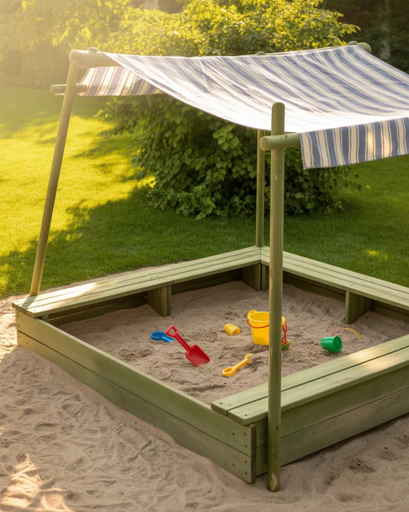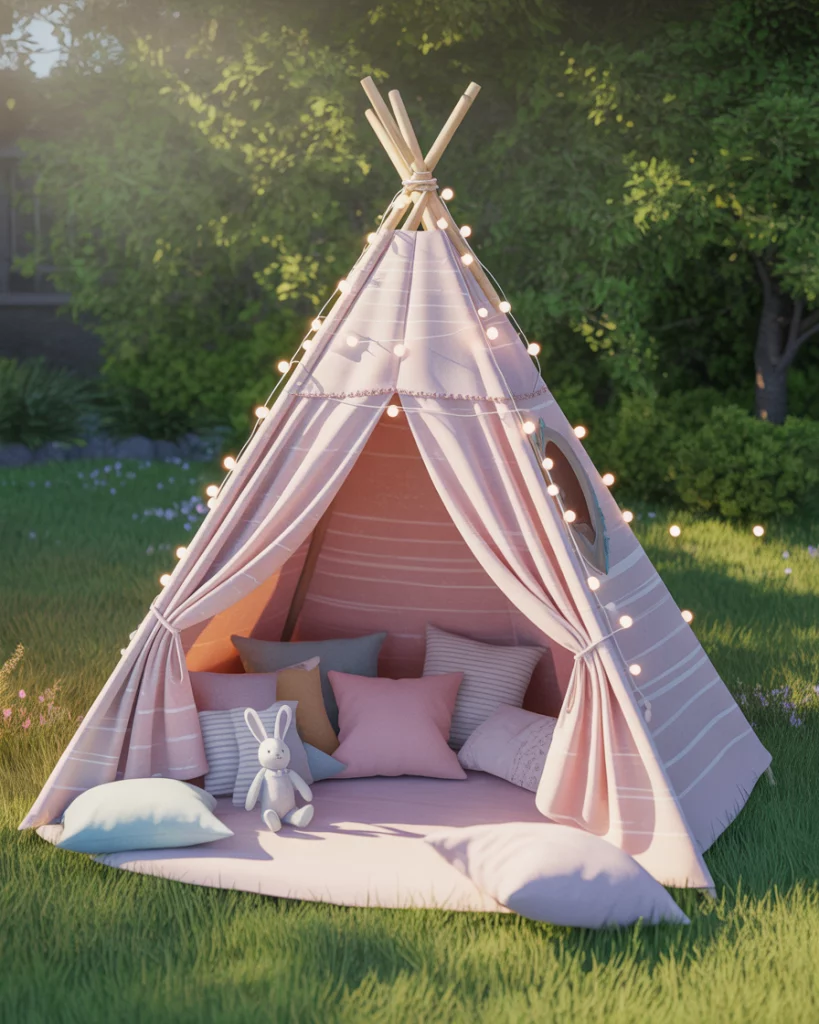 Sun protection is essential, but umbrellas can be awkward for play. Instead, make a kids shade structure out of canvas, bamboo or fabric to have a teepee or tent. This is a comfy snug where you can read, have picnics or a naptime. Perfect for toddlers, you can also use that space to create a cool down area. You can adorn it with fairy lights or pillows. A shaded spot also protects toys and books from fading or overheating.