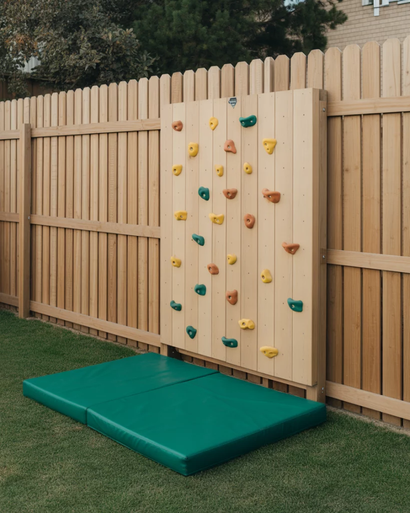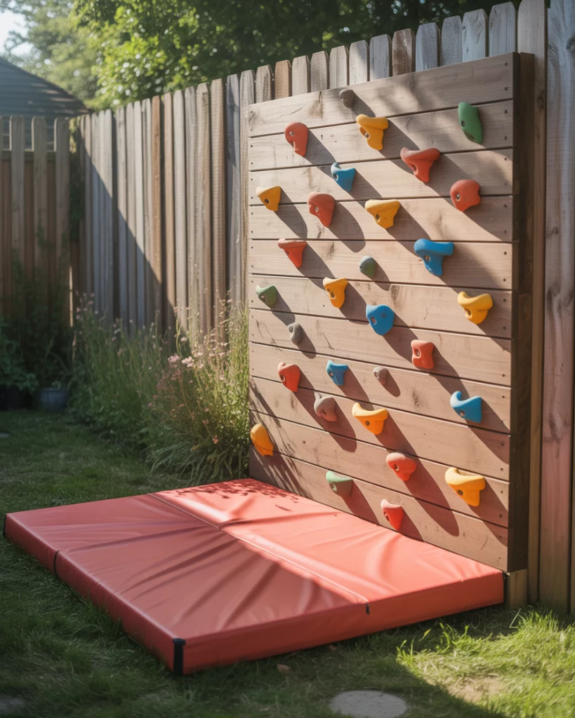 A vertical DIY climbing wall transforms any blank fence or shed wall into a muscle-building play space. Use colorful handholds and safety padding underneath. A solid compact method of interacting with the kids when there is limited space. A brilliant option for older kids who want a challenge and perfect for kids on a budget, since materials are simple.