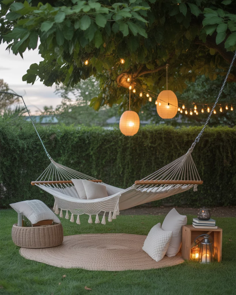 String up a hammock or hanging chair under a shady tree for a kids shade reading and relaxing nook. Provide pillows, soft light and waterproof cupboards with books or comics. Works beautifully for older kids who need a break from roughhousing, or as a bonding space for parents and toddlers during storytime.