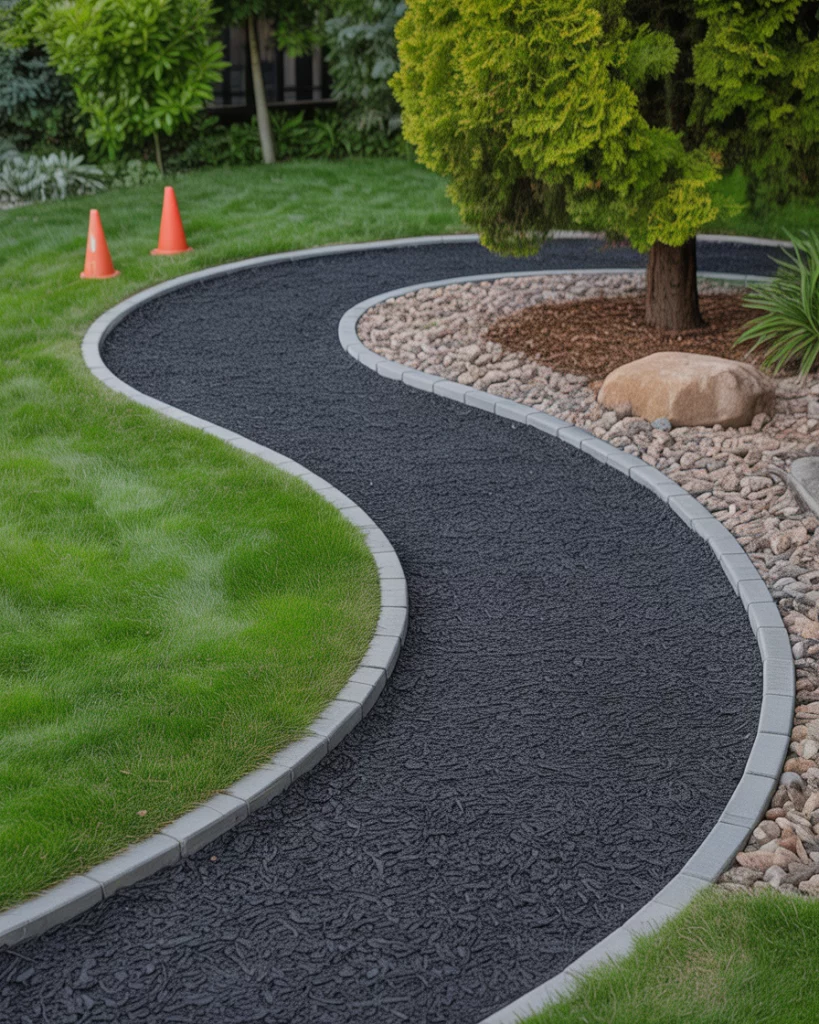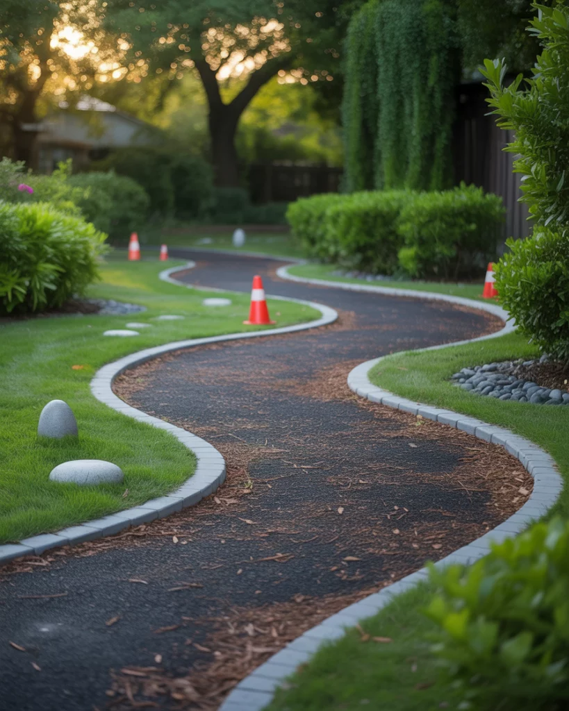 For a long-lasting, low-maintenance surface, use kids landscaping rubber mulch to build a small biking loop. Perfect for toddlers who are acquiring skills on trikes or other older children on scooters and bikes. The rubber covered surface cushions shapes the track out. Add some cones or signage for fun!