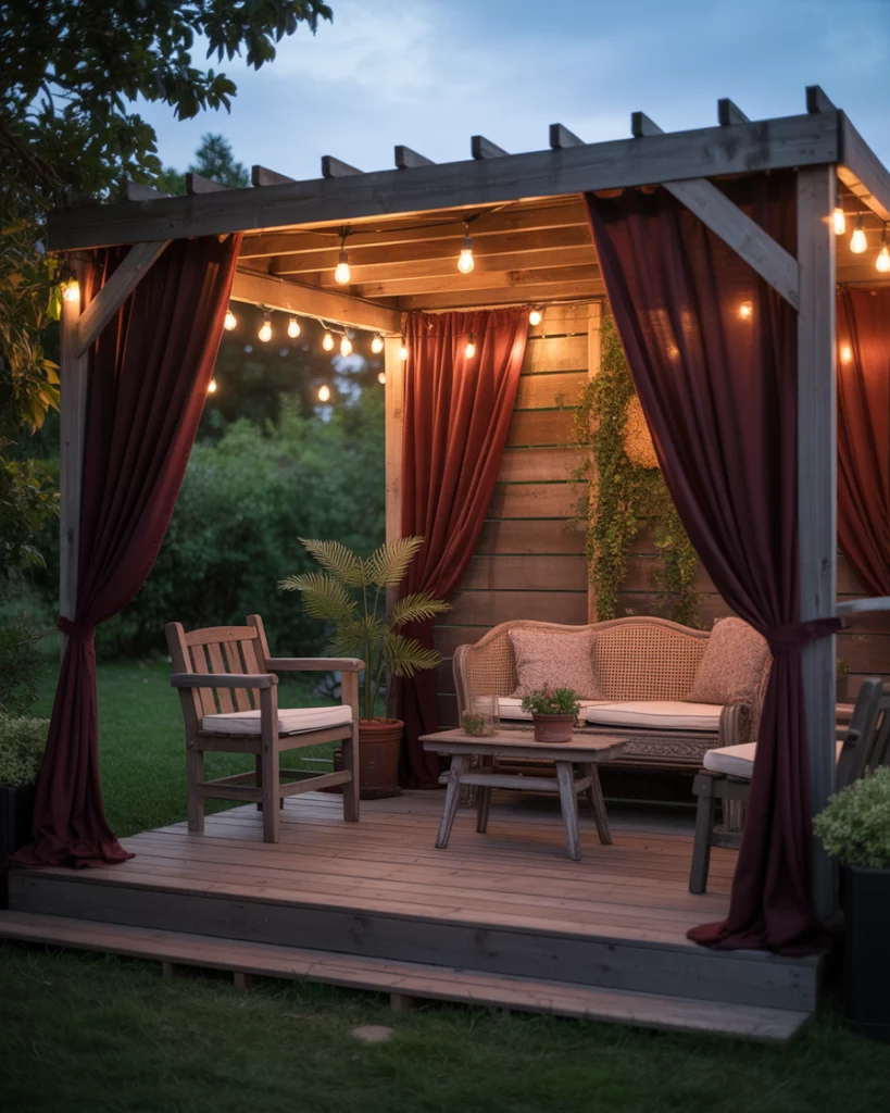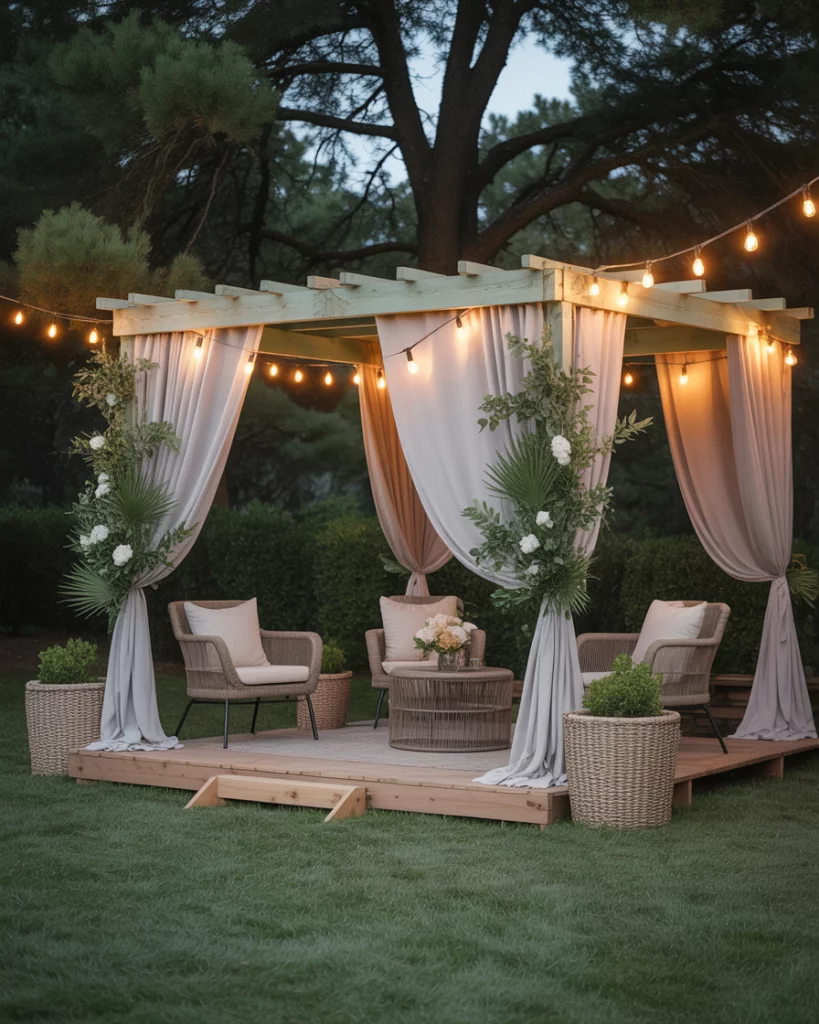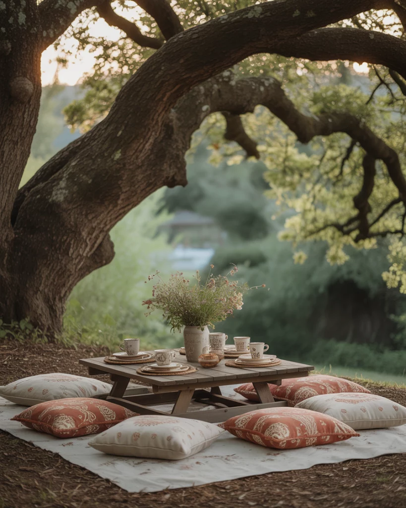 Create a kid-friendly picnic zone using low wooden tables and cozy floor cushions—an easy win for kids on a budget. Add shade to the kids: sit it under a shady tree or make your own canopy. It’s perfect for toddlers’ snacks, tea parties, and crafts, and can be styled up with tablecloths and outdoor string lights for a whimsical touch.