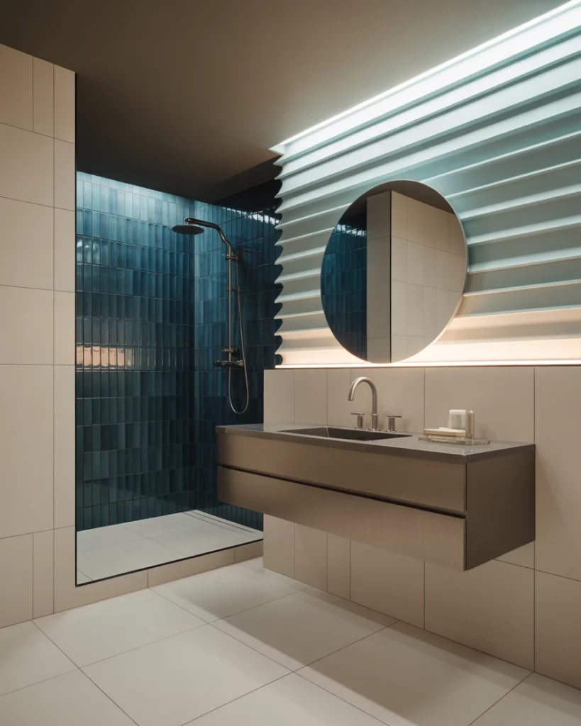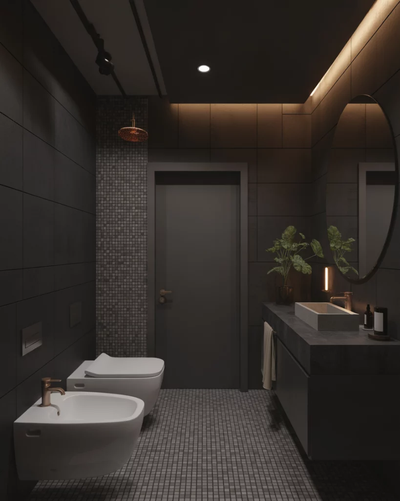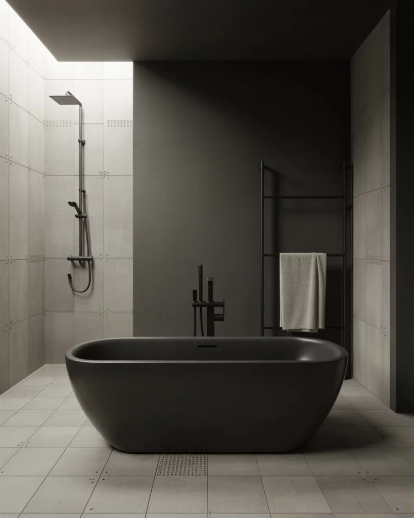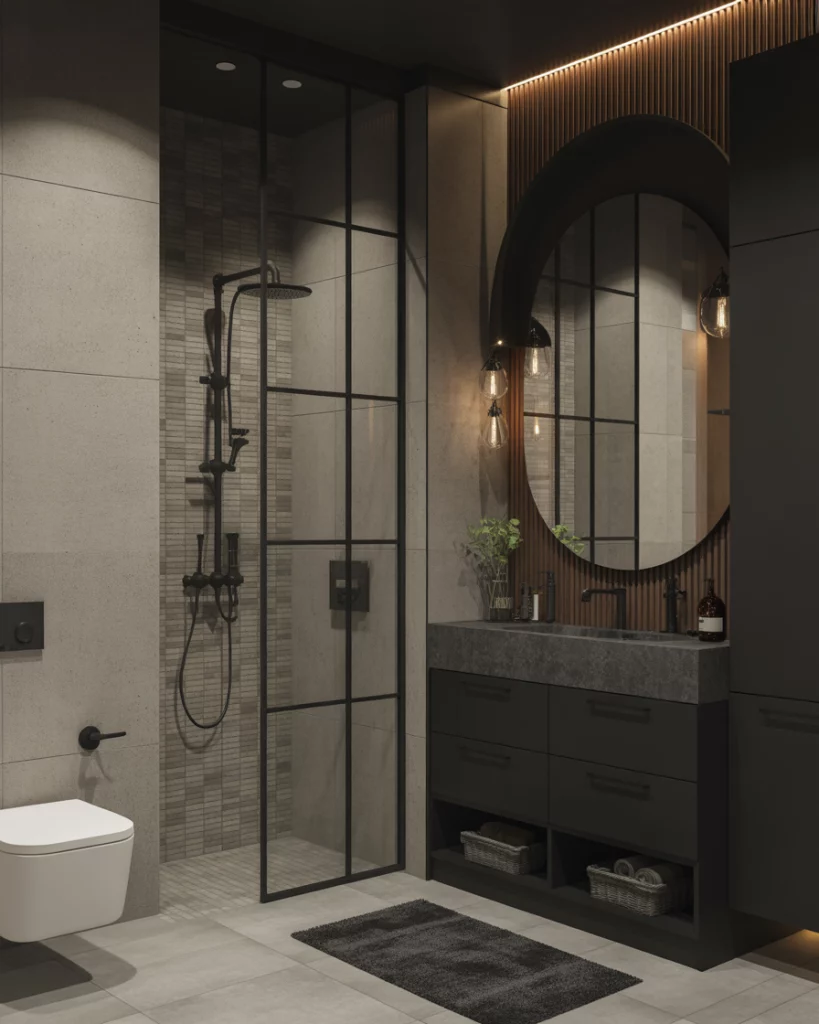 The industrial trend continues with dark tones, raw materials, and minimal finishes. Exposed pipes, matte black fixtures, and concrete tiles give bathrooms an urban edge. This style works especially well for lofts and modern apartments, where design modern blends with raw texture. It’s a luxury look that feels bold yet effortless.
