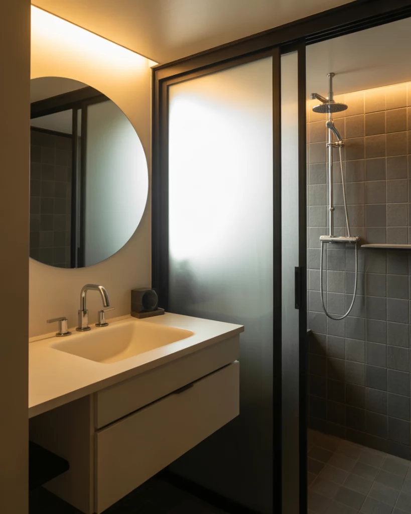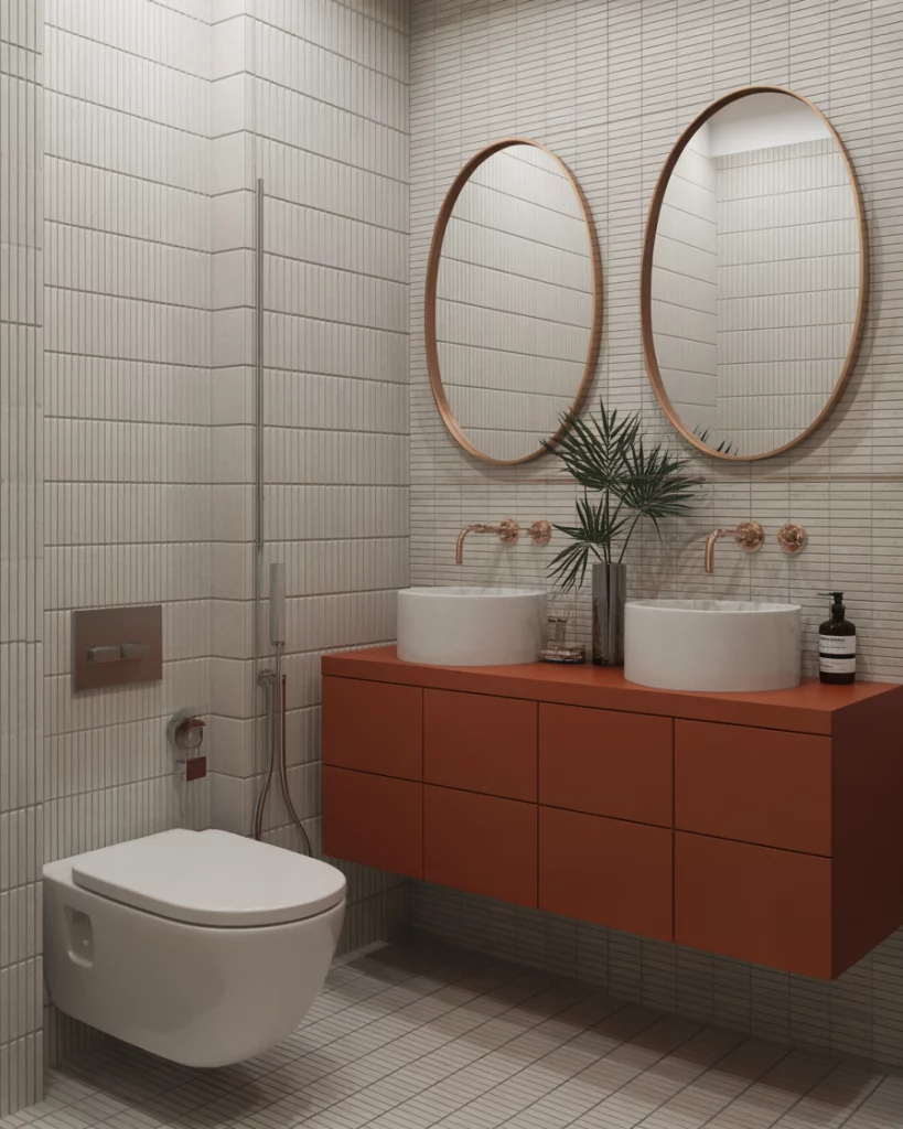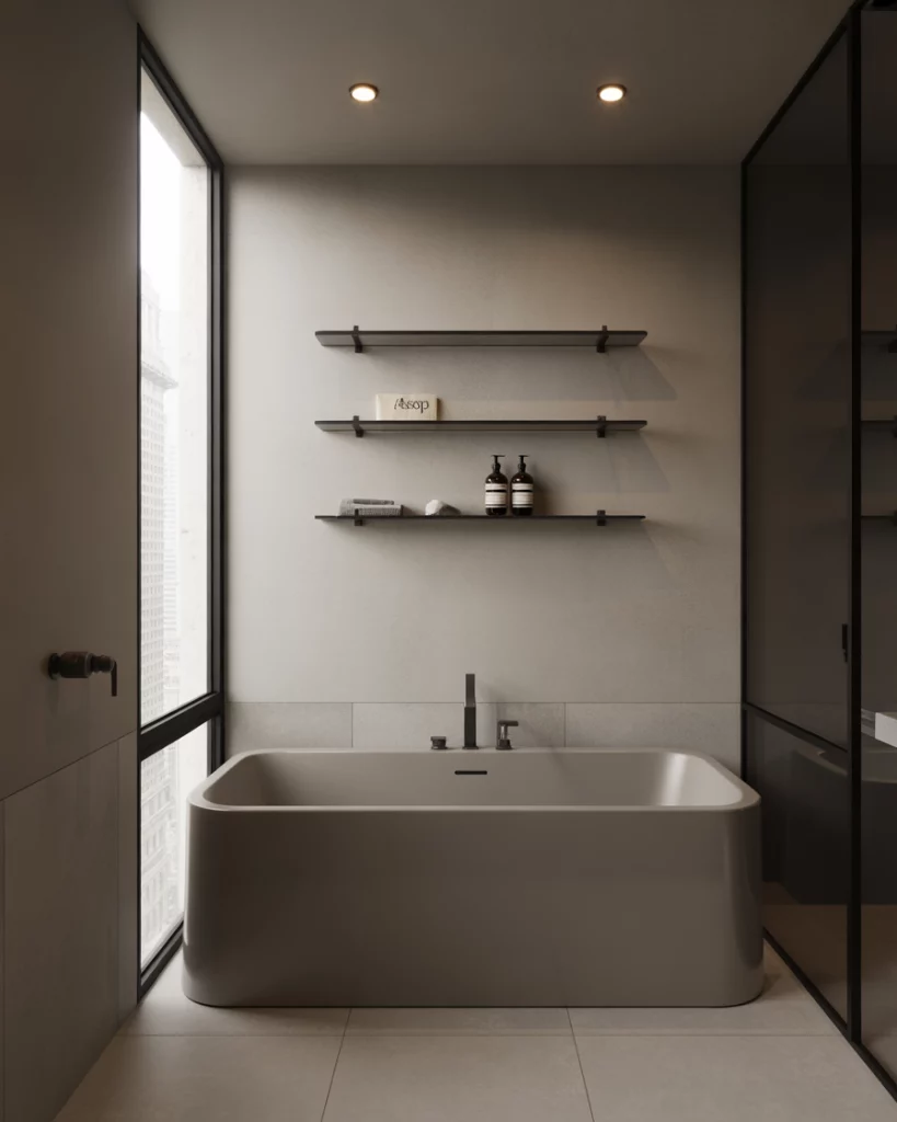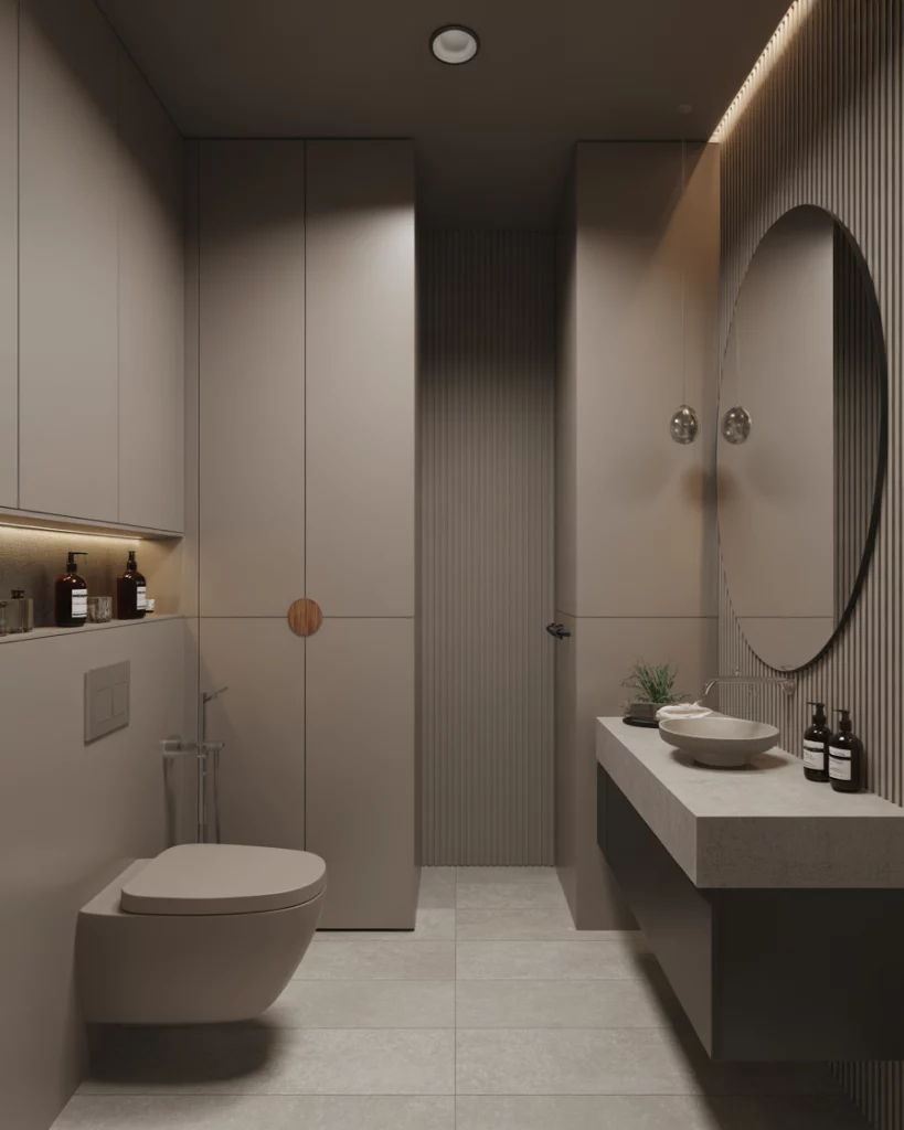 The industrial trend continues with dark tones, raw materials, and minimal finishes. Exposed pipes, matte black fixtures, and concrete tiles give bathrooms an urban edge. This style works especially well for lofts and modern apartments, where design modern blends with raw texture. It’s a luxury look that feels bold yet effortless.