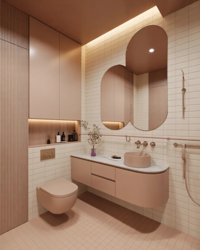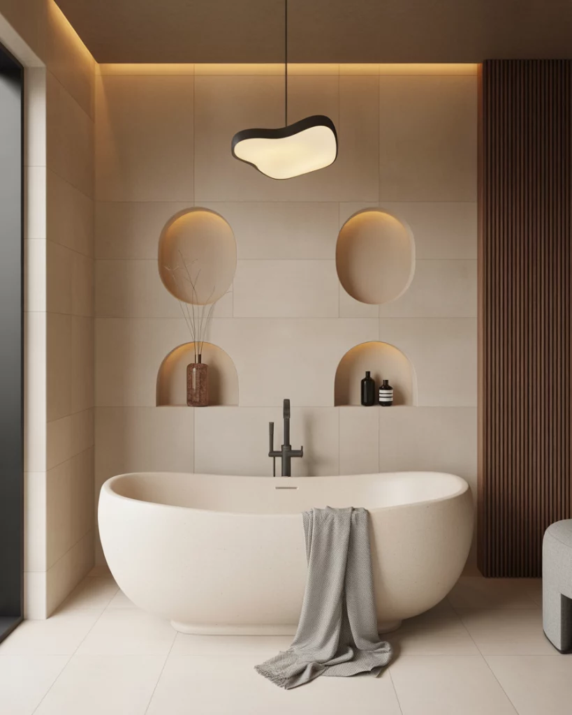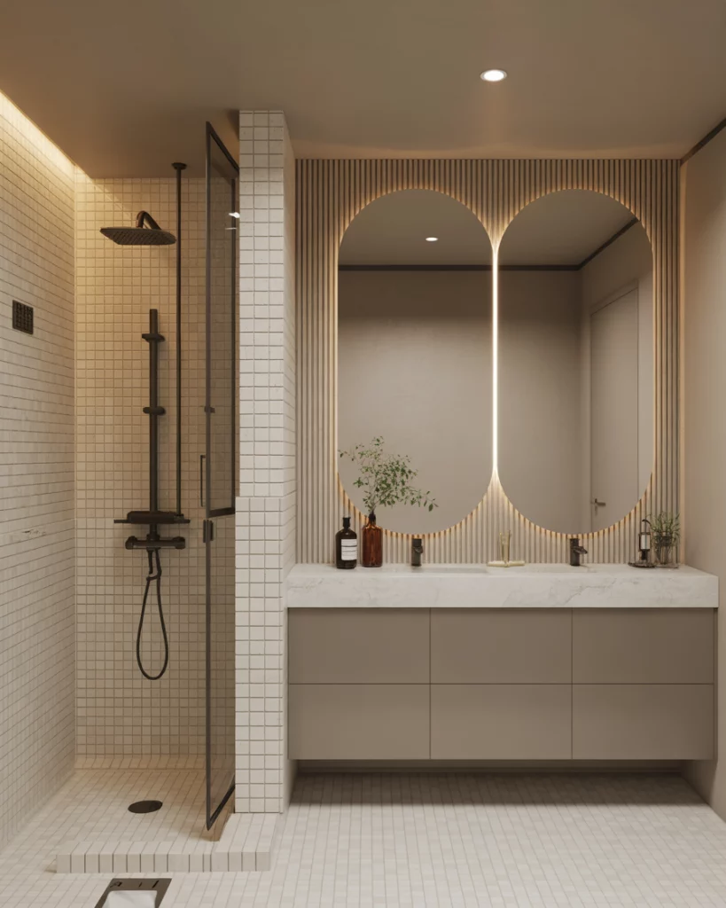 In 2026, bathrooms are moving away from sharp corners toward design modern curved shapes. Rounded vanities, oval mirrors, and arch-shaped showers bring fluidity and comfort. This luxury touch feels welcoming in both large and small space interiors. Designers often highlight that soft edges reduce visual tension, giving bathrooms an organic and calming character.