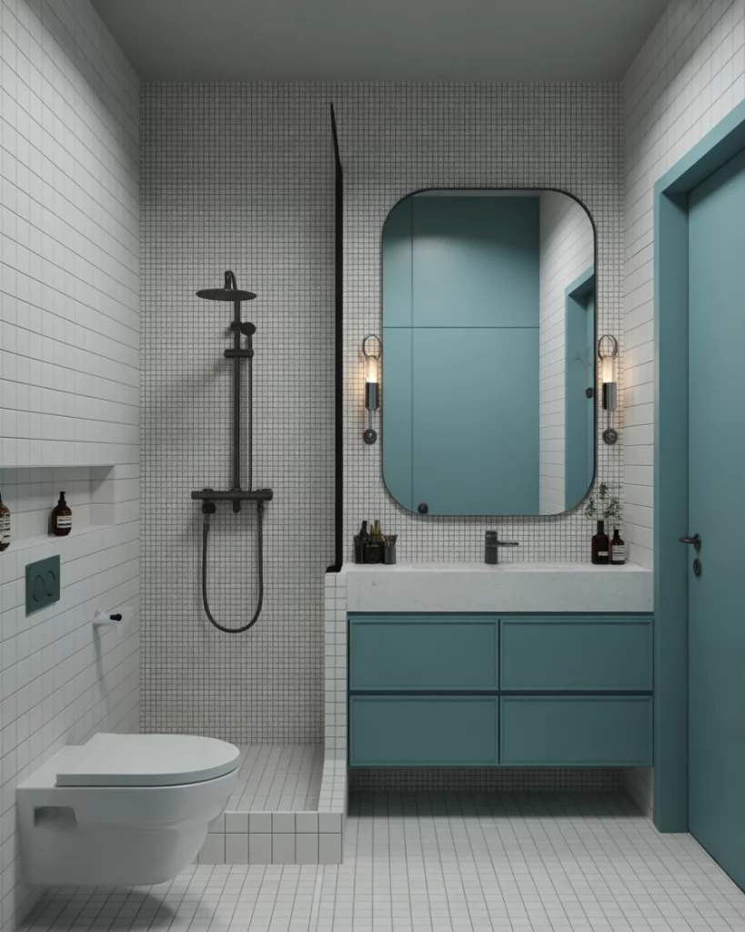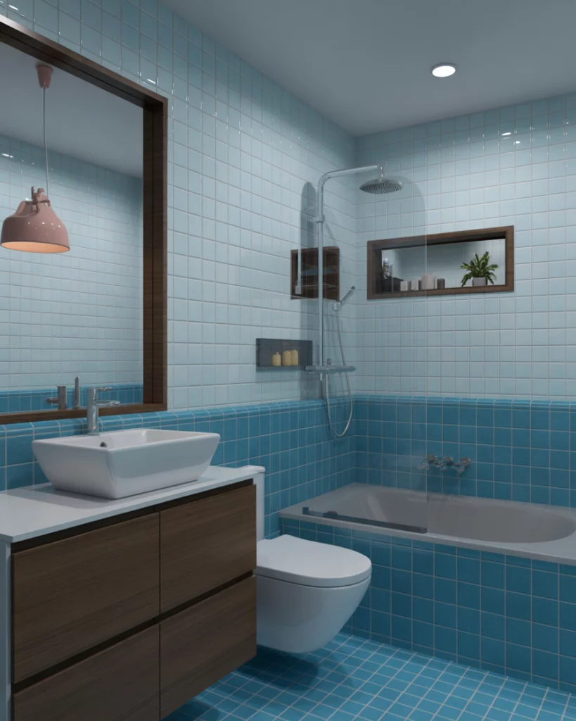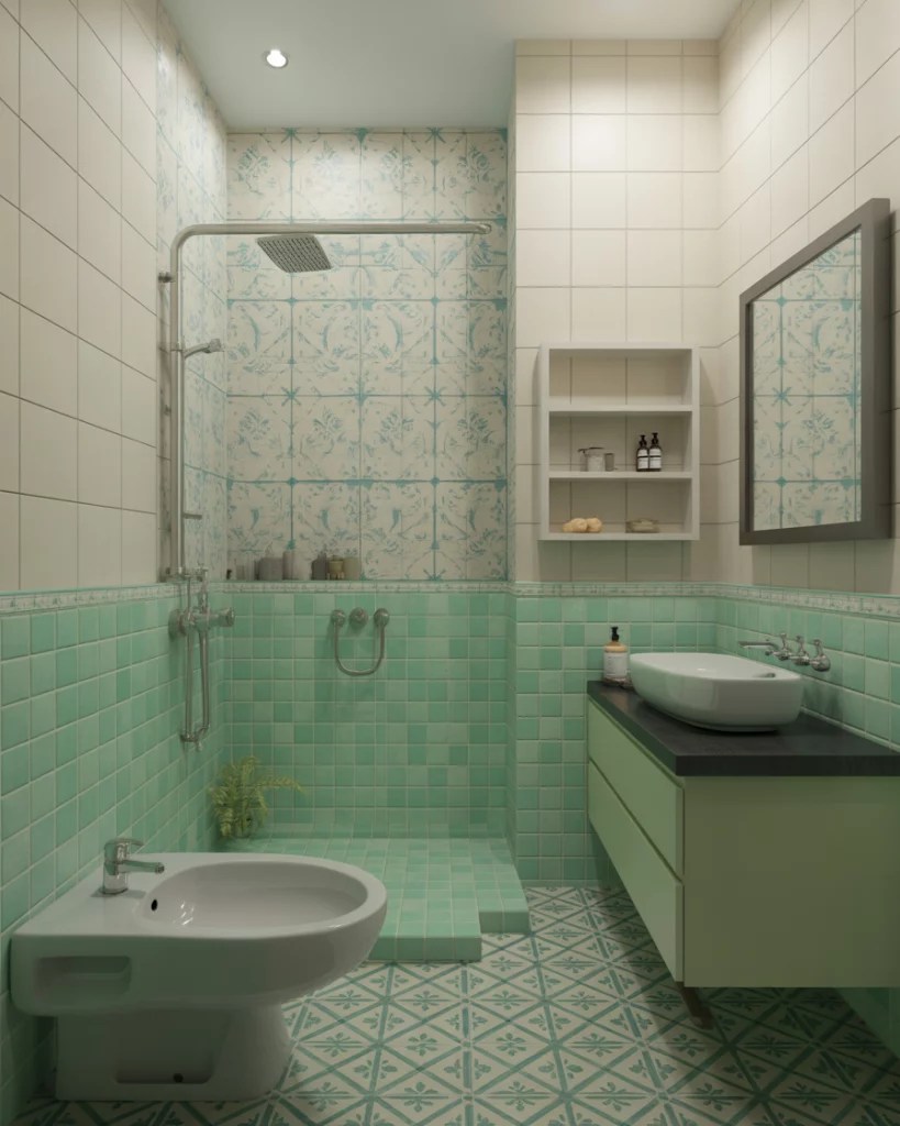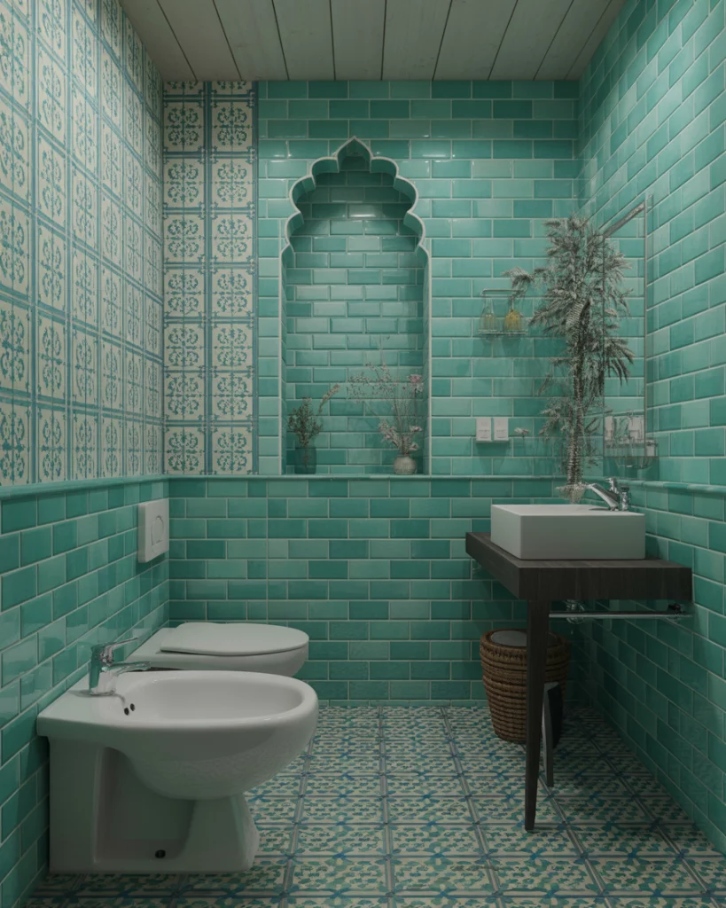 Drawing from Indian influences, vibrant blue and green tiles dominate this global trend. Geometric or floral patterns bring boldness into the bathroom, merging tradition with design modern function. For small space Indian homes, this look creates cheerful and cultural identity while keeping the atmosphere stylish and fresh.