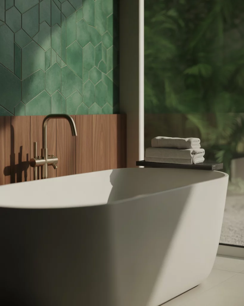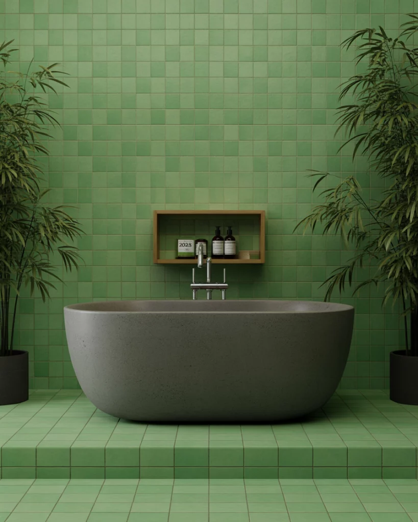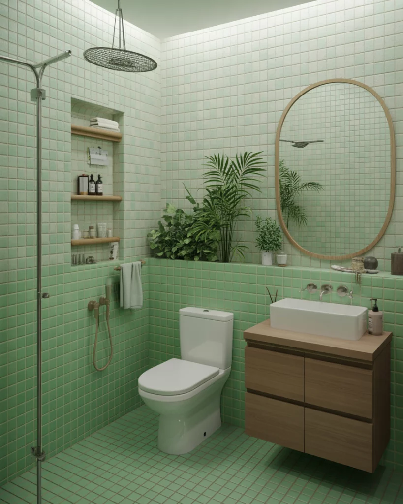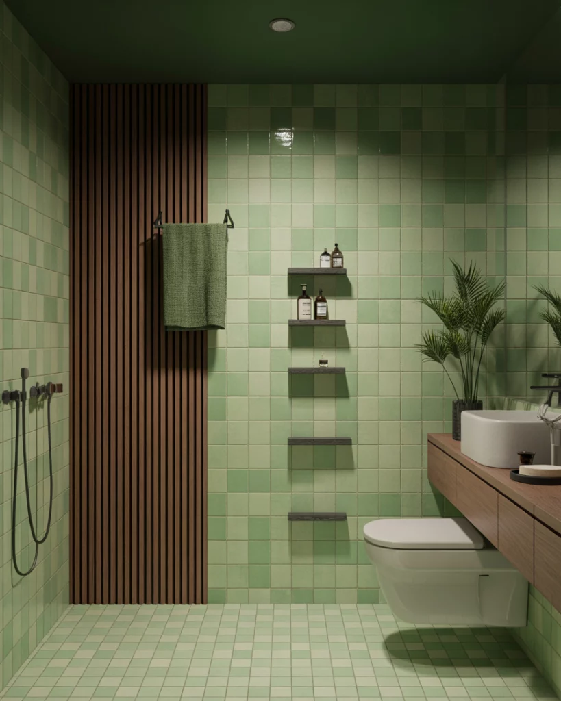 Bathrooms lined with green tiles are trending for their fresh, aesthetic appeal. Whether emerald mosaics or pale mint ceramics, they bring energy and serenity into the space. Combined with indoor plants and stone textures, this style creates a natural sanctuary. Green bathrooms are especially popular with homeowners who want a mindful, grounding retreat in their daily lives.