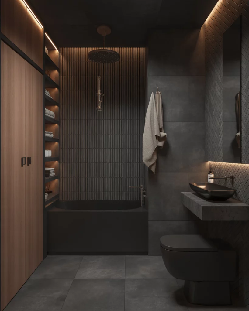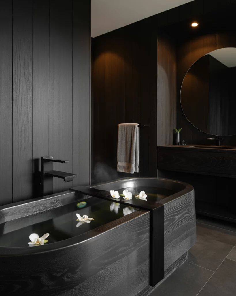 Pairing black surfaces with wooden textures creates dramatic design luxury black bathrooms. In 2026, this combination balances strength and warmth—ideal for homeowners who want a moody yet inviting look. The dark backdrop allows wood grains to pop, resulting in a stylish, grounded, and highly personalized retreat.