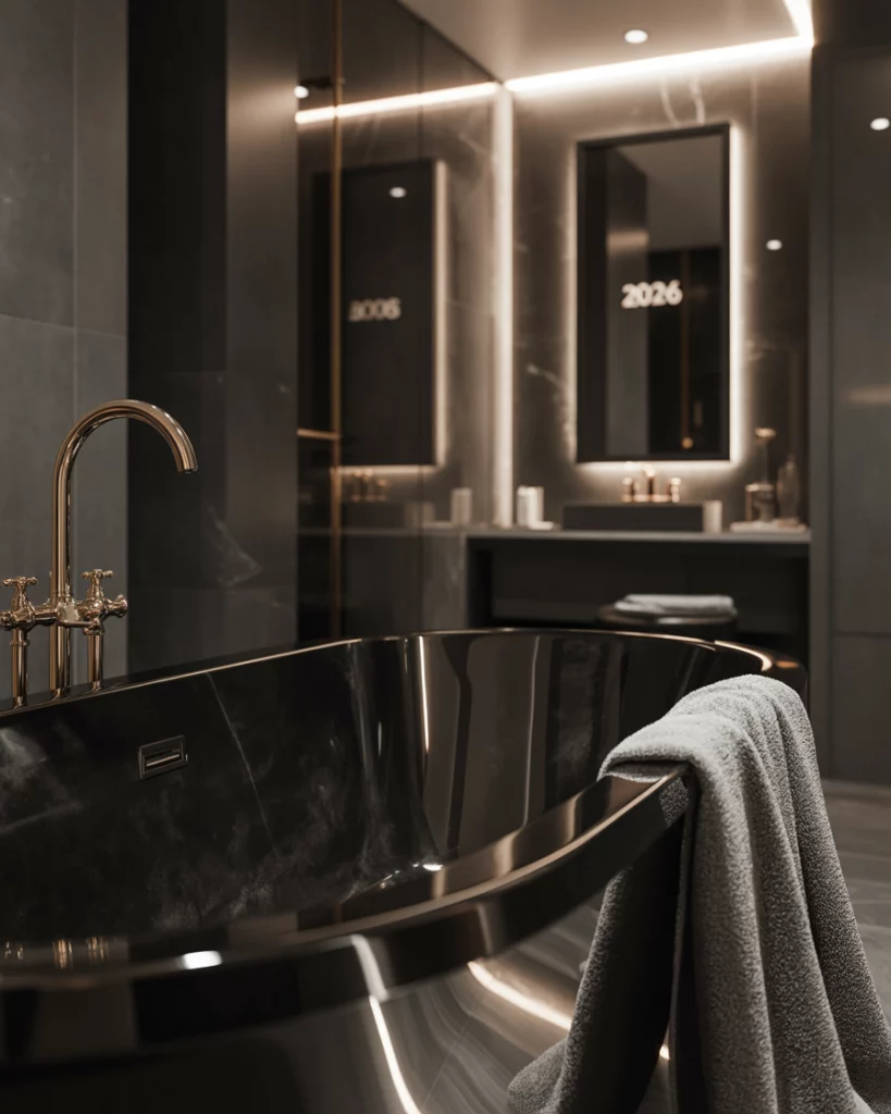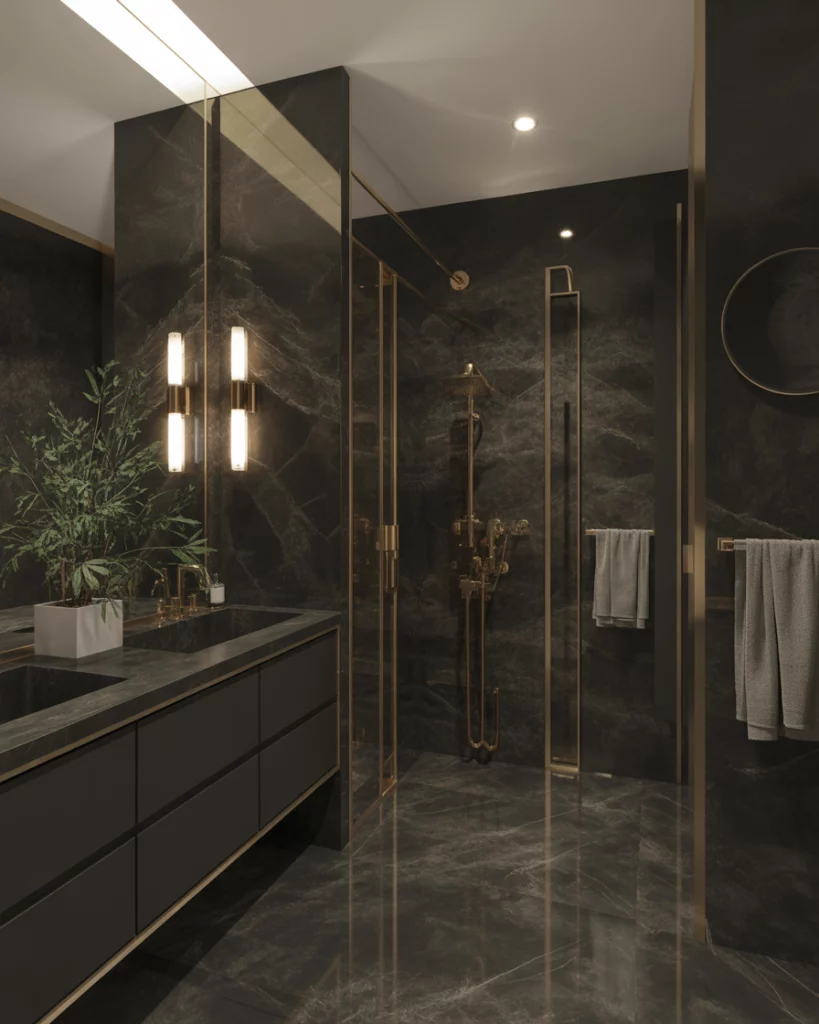 Marble never goes out of style, but in 2026, dark variations dominate design luxury modern bathrooms. Deep grey or black marble paired with gold or brass fixtures elevates the interior with instant luxury. Whether in flooring, walls, or countertops, this design luxury black concept works for dramatic yet timeless elegance.