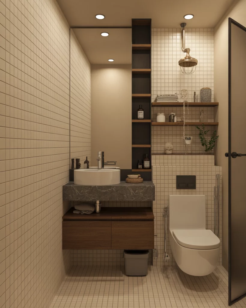 A clever way to maximize tiny and small space Indian bathrooms is by installing floating sinks and storage. In 2026, these design small Indian modern solutions create openness while maintaining practicality. This approach works especially well in urban apartments, where every inch matters, proving that design ideas can merge function and style.
