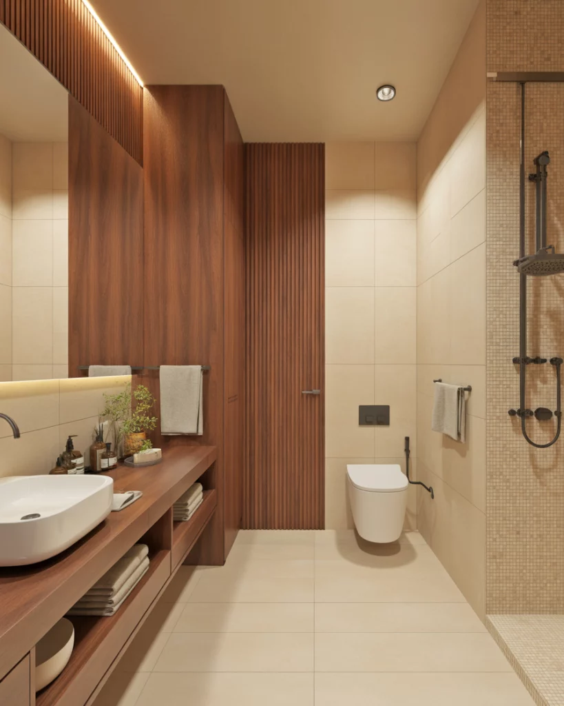 Adding wooden finishes instantly makes a bathroom feel warmer and more inviting. Whether through vanities, shelving, or even wood-look tiles, this style mixes natural textures with modern efficiency. A design modern bathroom softened with oak or teak details creates a spa-like atmosphere perfect for unwinding. Many designers note that wood adds both timeless charm and eco-conscious appeal.