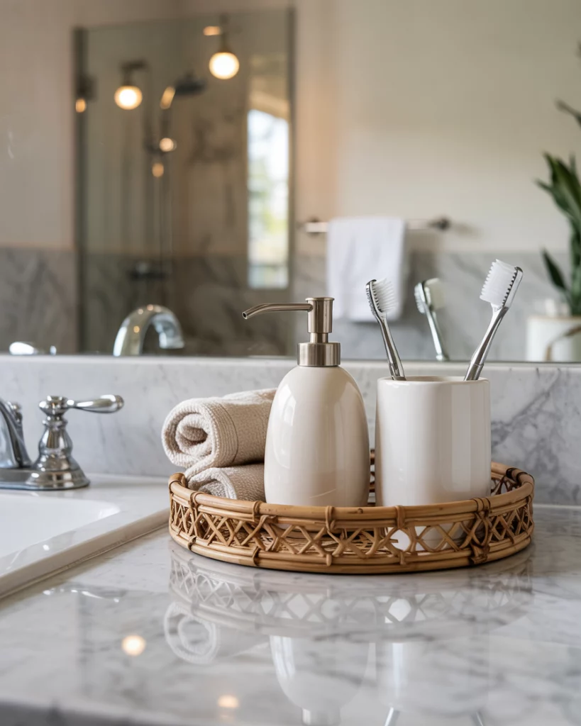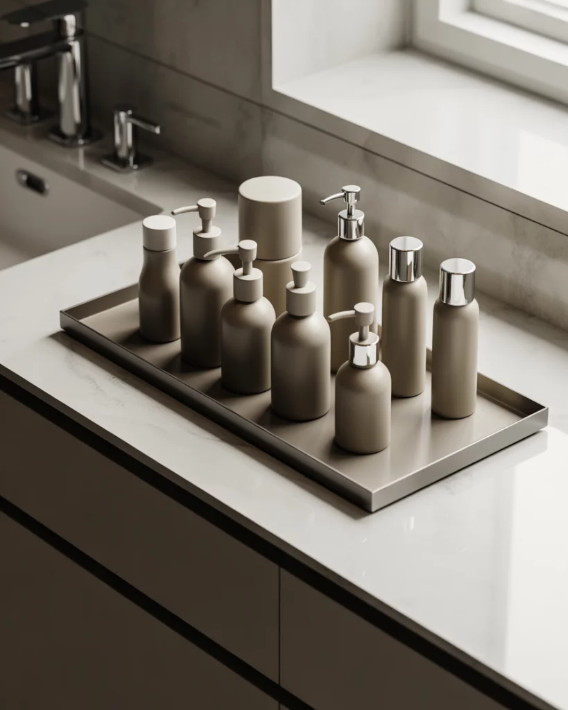 Modern luxury bathrooms are all about textures. Pair marble countertops with matte metal trays and glass jars for a cohesive, elevated look. This aesthetic blends opulence with order—your soap, cotton balls, and skincare bottles become part of the décor. Minimalist tips: keep everything in sets of three, balance colors, and leave negative space for breathing room. Function meets fashion flawlessly.