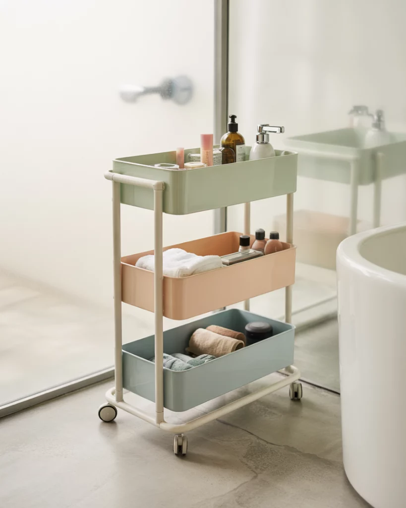 A rolling cart is a lifesaver when you share a bath or have limited cabinetry. Perfect for dorm life or small-space apartments, these portable units can store towels, makeup, and cleaning supplies. Slide it beside the vanity or even inside a closet when guests arrive. Combine bins from the dollar store to create color-coded tiers—one for hair care, one for men’s grooming, and one for DIY cleaning solutions. Practical, mobile, and stylish all in one.