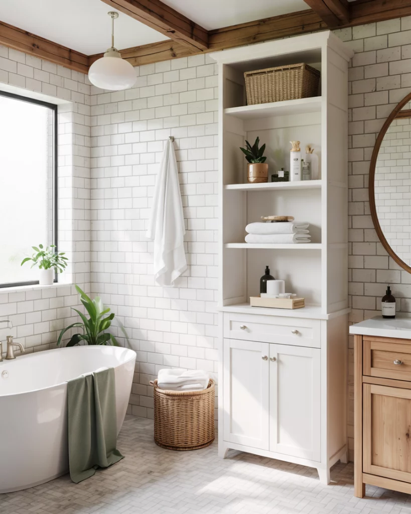 If your bathroom has an awkward gap, install a vertical tower cabinet for tall shelves. These sleek structures can hold linens, baskets, or folded towels while adding visual height. It’s a great hack for tiny homes or rental apartments with no built-in closet. Many homeowners choose wood tones or matte finishes to create a spa-like aesthetic that feels intentional rather than improvised.