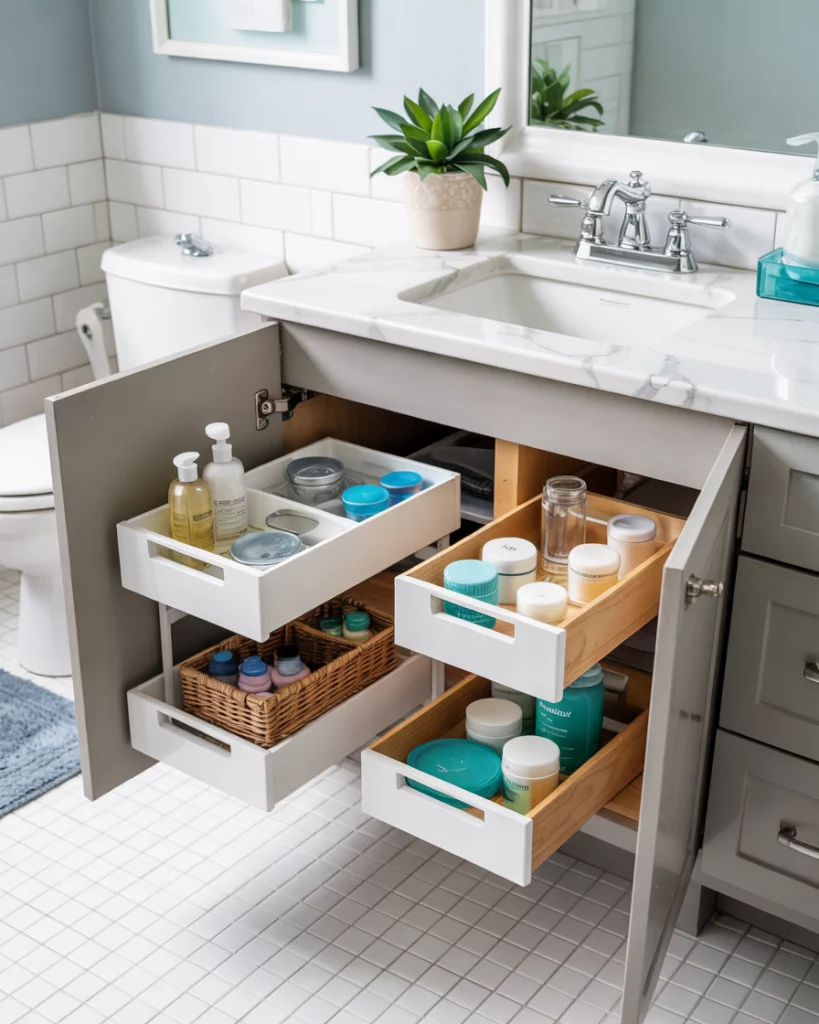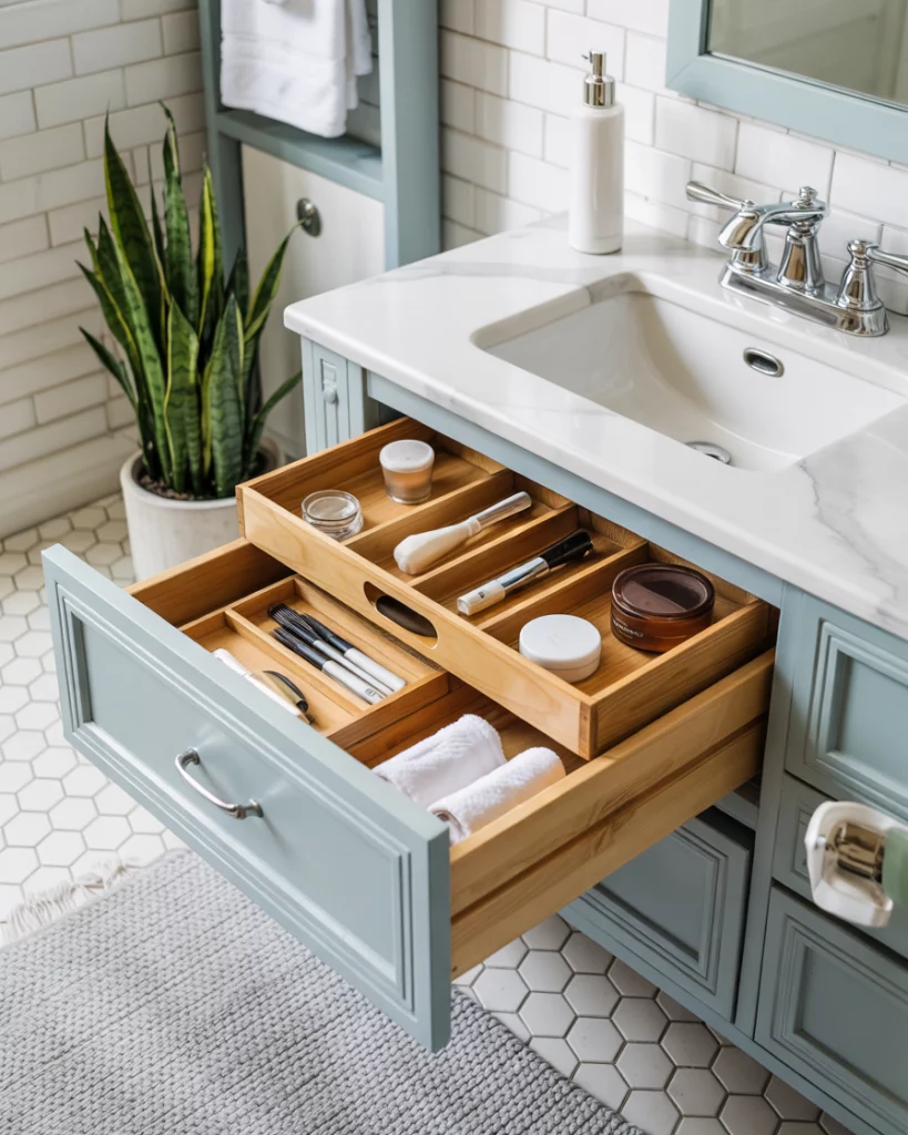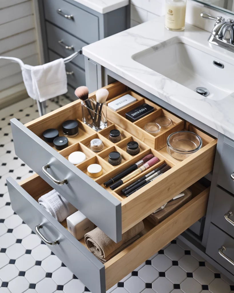 A trend gaining traction in 2026: hidden layers inside vanity drawers. These ideas for drawer designs separate shallow trays for makeup or skincare from deeper sections for tools or hairdryers. It’s a space-saving hack that keeps counters clear but everything easy to find. Try installing a sliding divider or adding stackable inserts to existing drawers—a quick DIY project that instantly upgrades your vanity’s efficiency.