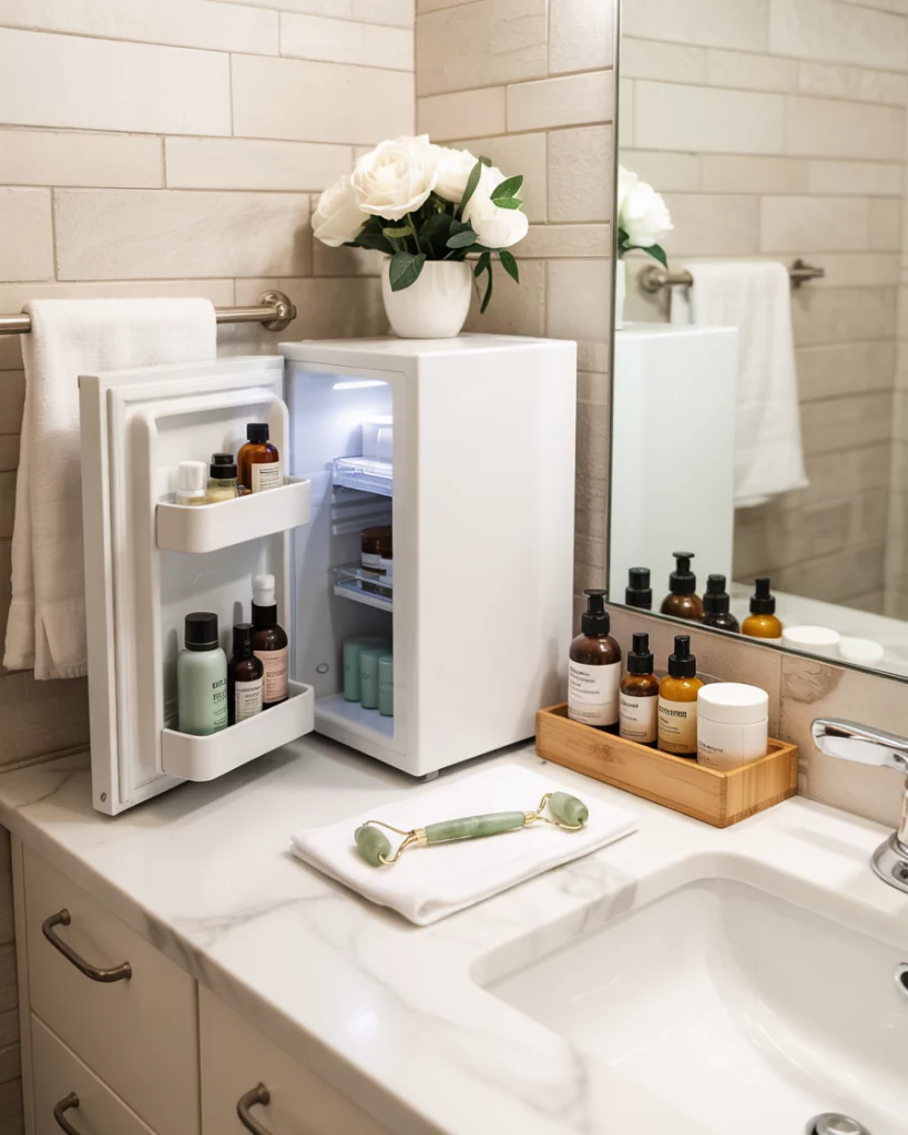 Beauty enthusiasts are embracing skincare fridges built right into vanity cabinets or countertop niches. These compact coolers protect serums, masks, and creams while maintaining a chic aesthetic. Pair the fridge with matching trays or shelves to store jade rollers and gua sha tools. For smaller setups, a mini fridge from a dollar store brand works fine—proof you can mix luxury and DIY style without breaking the budget.