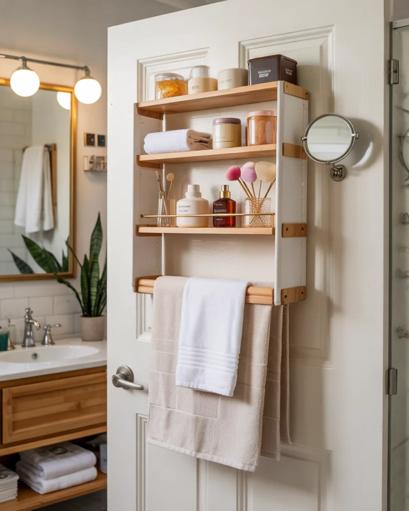 As floor space begins to vanish, go vertical once more—but this time behind a door. Over-door organizers are ideal for storing towels, dryers, and even makeup caddies. Start with slim metal racks and switch to corresponding pouches for a better look. It is a tip that can significantly decrease clutter in a small shared bathroom without spending a penny. Pair this storage solution with a complimentary under-sink bin organization system for a perfectly coordinated look.