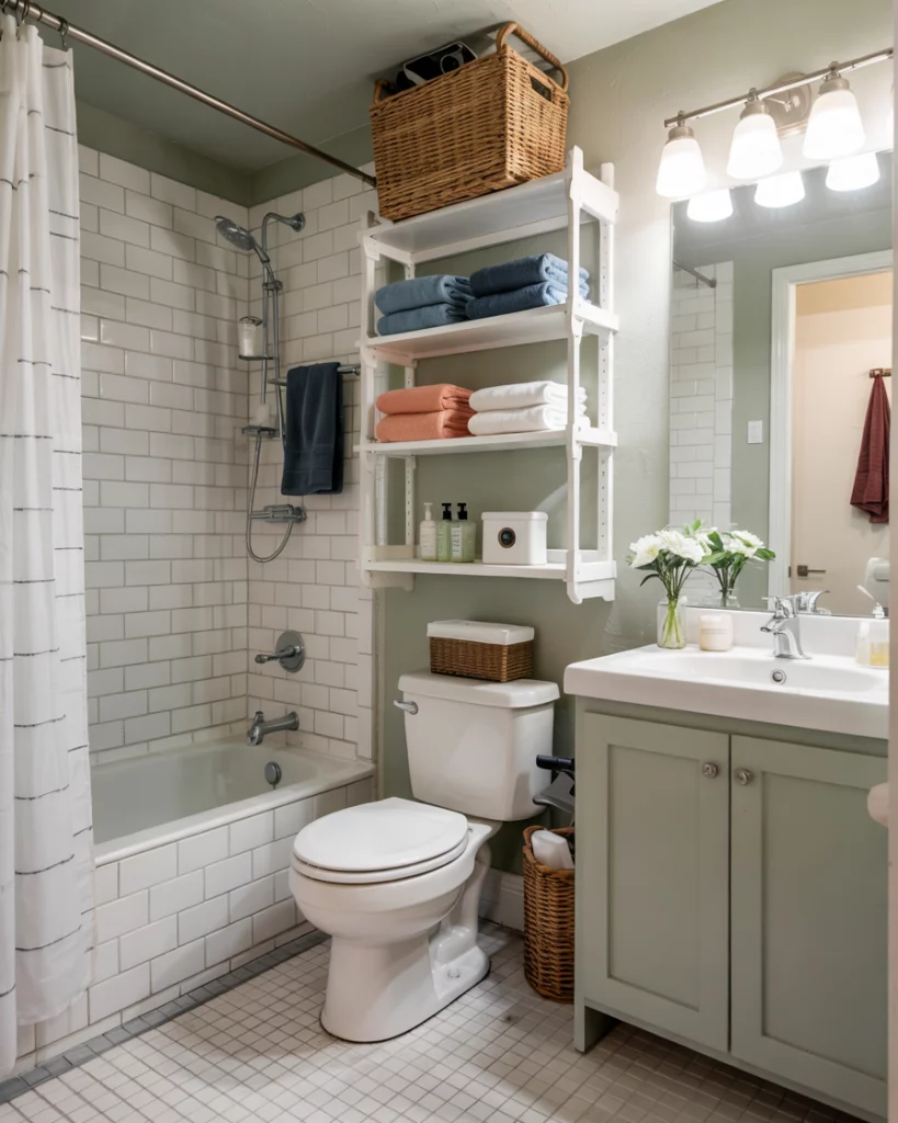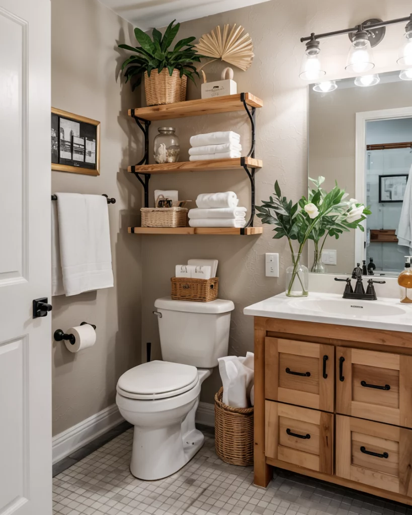 One often-overlooked area in bathrooms is the space above the toilet. Installing an over-toilet shelving unit or tall wall-mounted storage leverages height and keeps floor space open. These solutions are especially useful in small-space bathrooms. Use the top shelf for extra towels or guest items, the middle shelves for everyday items in attractive baskets, and the lower shelf for decorative elements. It’s a smart hacks approach that blends utility with design.