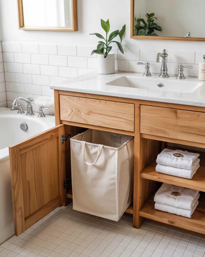 Laundry management often ruins the vibe of an organized bath. Built-in hampers tucked under the sink or behind faux panels are the new luxury standard. Choose removable cloth bags or slim bins from Dollar Tree for budget-friendly DIY setups. This idea suits tiny or apartment bathrooms where space is scarce. Add subtle ventilation holes and handles for convenience—proof that even practical solutions can match your aesthetic vision.