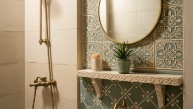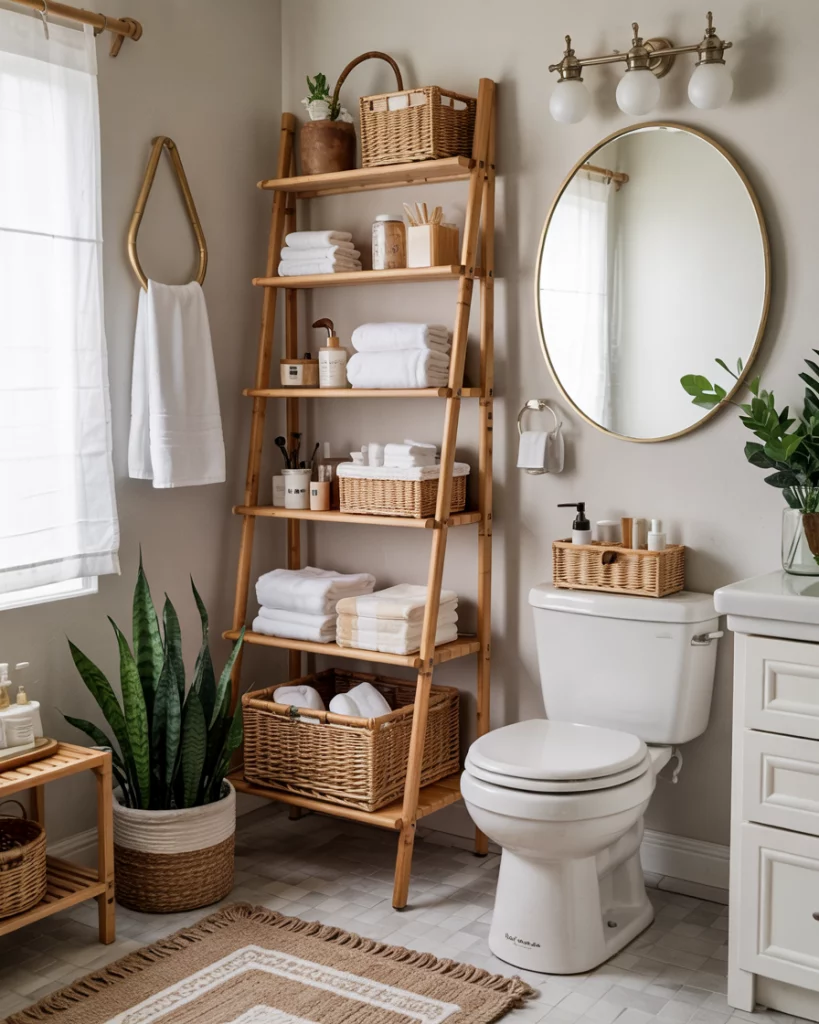 Every surface can multitask if styled right. Decorative ladders, woven baskets, or ottomans with compartments double as design and ideas storage. A bamboo ladder can hold towels while adding warmth to your small space. Combine this with clear jars for makeup or skincare, and you get both function and inspo for a cozy, curated look. These tips bring comfort and practicality together, ideal for shared or guest baths.