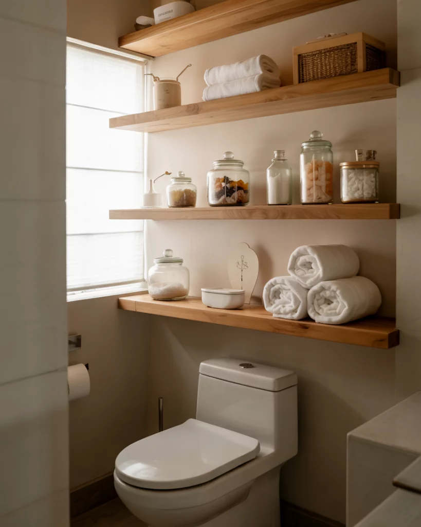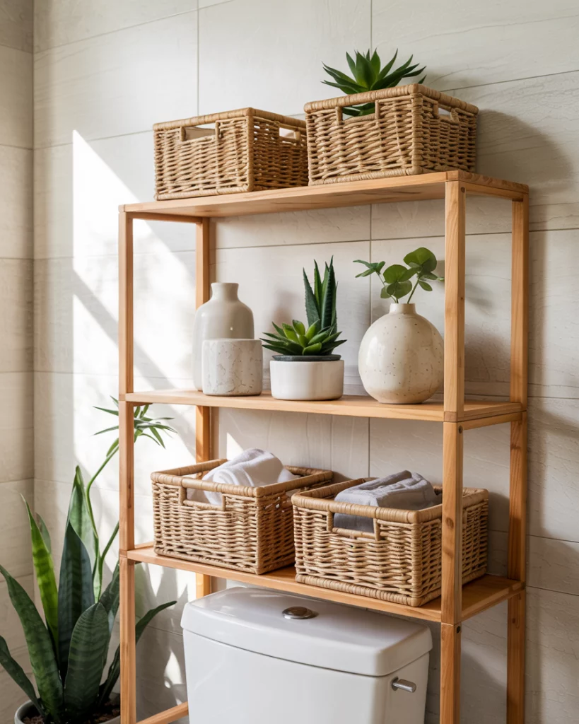 One often-overlooked area in bathrooms is the space above the toilet. Installing an over-toilet shelving unit or tall wall-mounted storage leverages height and keeps floor space open. These solutions are especially useful in small-space bathrooms. Use the top shelf for extra towels or guest items, the middle shelves for everyday items in attractive baskets, and the lower shelf for decorative elements. It’s a smart hacks approach that blends utility with design.