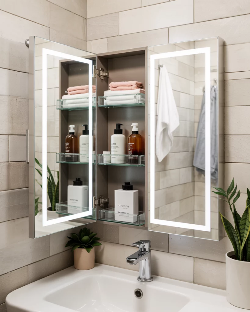 Mirrored cabinets remain timeless, but in 2026 they’re smarter—think motion-sensor LED mirrors with built-in storage. They hide your toothbrushes, skincare, and medications without adding visual clutter. Ideal for tiny bathrooms or apartment living, this setup maximizes wall space and keeps your countertop clear. Many homeowners combine this look with minimal handles or magnetic closures for a smooth, aesthetic finish that feels both high-tech and luxurious.