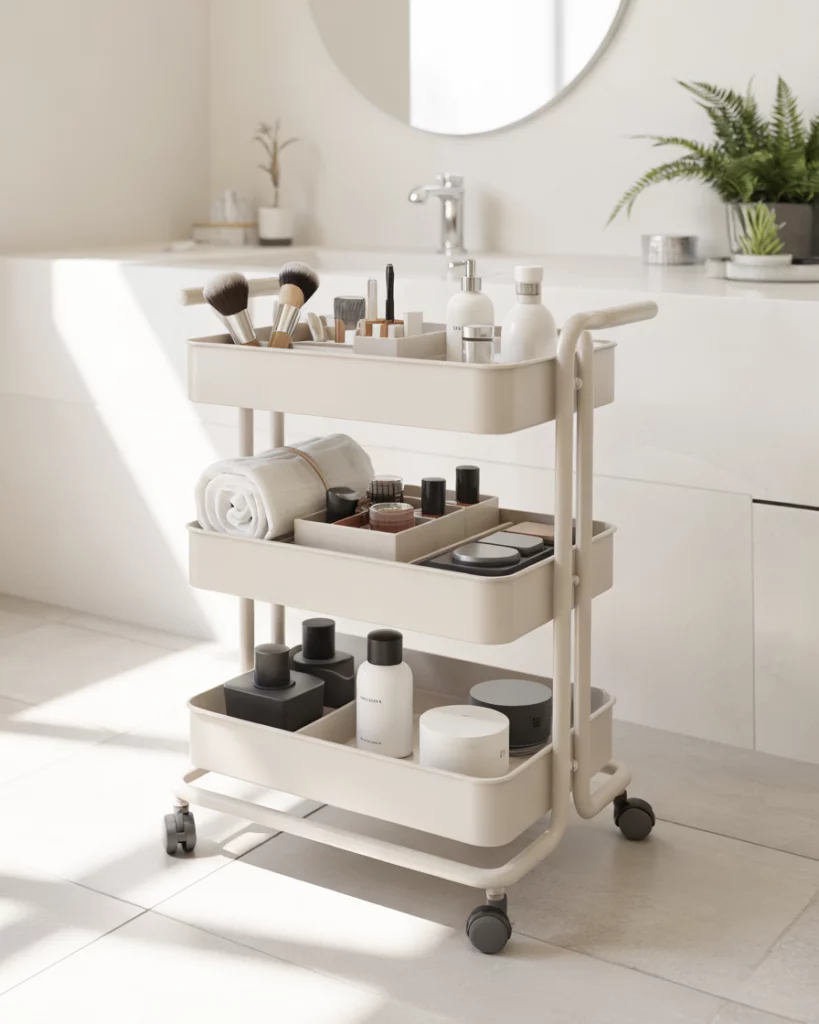 A rolling cart is a lifesaver when you share a bath or have limited cabinetry. Perfect for dorm life or small-space apartments, these portable units can store towels, makeup, and cleaning supplies. Slide it beside the vanity or even inside a closet when guests arrive. Combine bins from the dollar store to create color-coded tiers—one for hair care, one for men’s grooming, and one for DIY cleaning solutions. Practical, mobile, and stylish all in one.