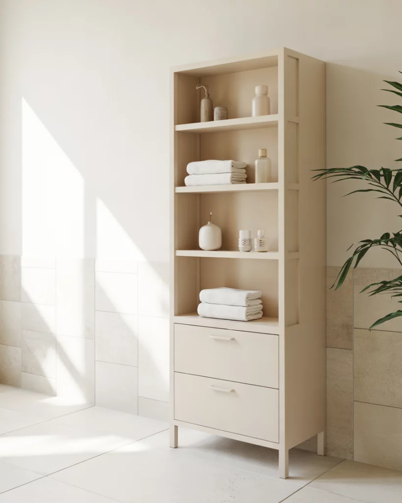 If your bathroom has an awkward gap, install a vertical tower cabinet for tall shelves. These sleek structures can hold linens, baskets, or folded towels while adding visual height. It’s a great hack for tiny homes or rental apartments with no built-in closet. Many homeowners choose wood tones or matte finishes to create a spa-like aesthetic that feels intentional rather than improvised.