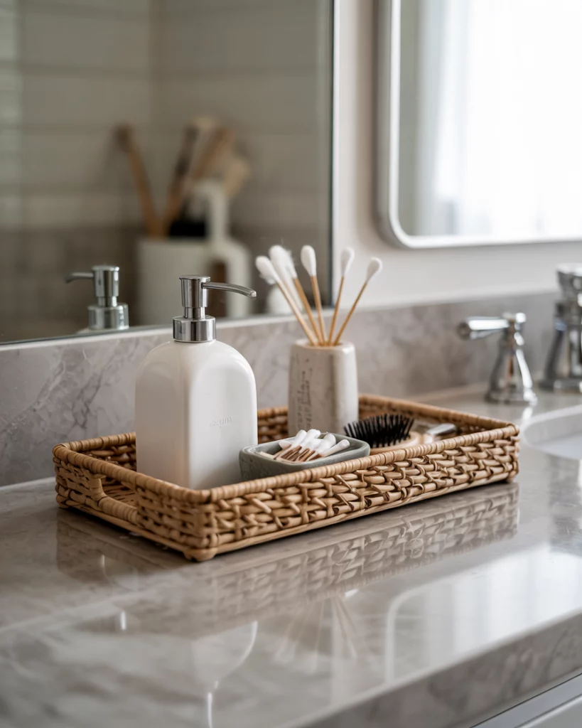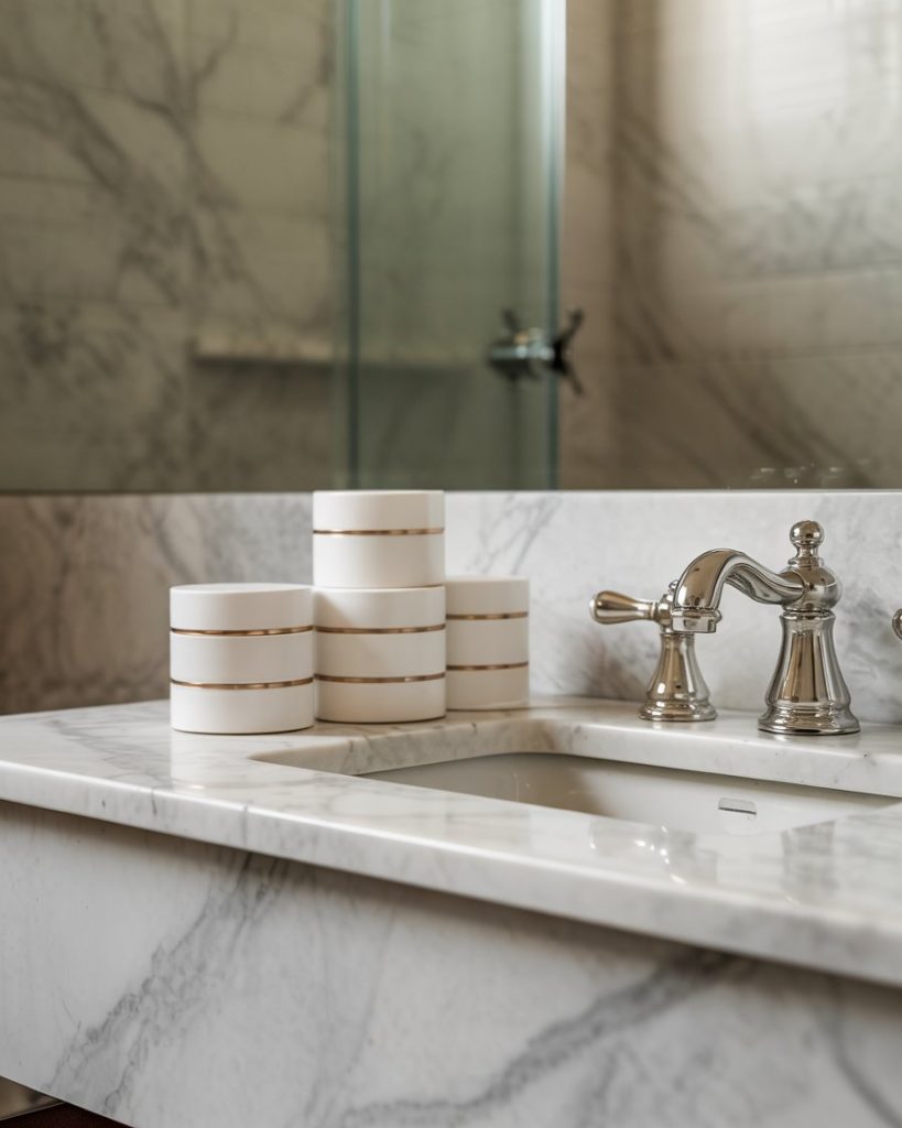 Modern luxury bathrooms are all about textures. Pair marble countertops with matte metal trays and glass jars for a cohesive, elevated look. This aesthetic blends opulence with order—your soap, cotton balls, and skincare bottles become part of the décor. Minimalist tips: keep everything in sets of three, balance colors, and leave negative space for breathing room. Function meets fashion flawlessly.