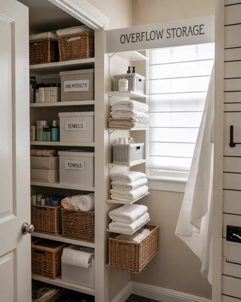 If you’re short on built-ins, turn a hallway closet or linen cabinet into extended bathroom storage. Label bins for “skincare,” “guest towels,” and “cleaning.” Add small shelves and baskets from Dollar Tree or dollar store aisles. This DIY idea helps shared households—especially families—keep the bathroom clear and the closet purposeful. Bonus: it’s a renter-friendly upgrade that can move with you.