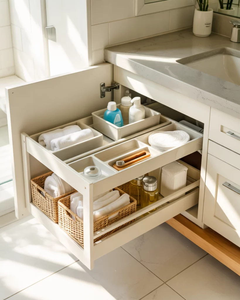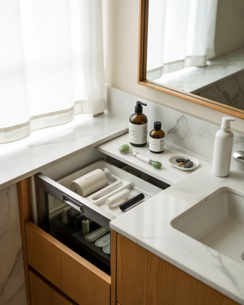 A trend gaining traction in 2026: hidden layers inside vanity drawers. These ideas for drawer designs separate shallow trays for makeup or skincare from deeper sections for tools or hairdryers. It’s a space-saving hack that keeps counters clear but everything easy to find. Try installing a sliding divider or adding stackable inserts to existing drawers—a quick DIY project that instantly upgrades your vanity’s efficiency.