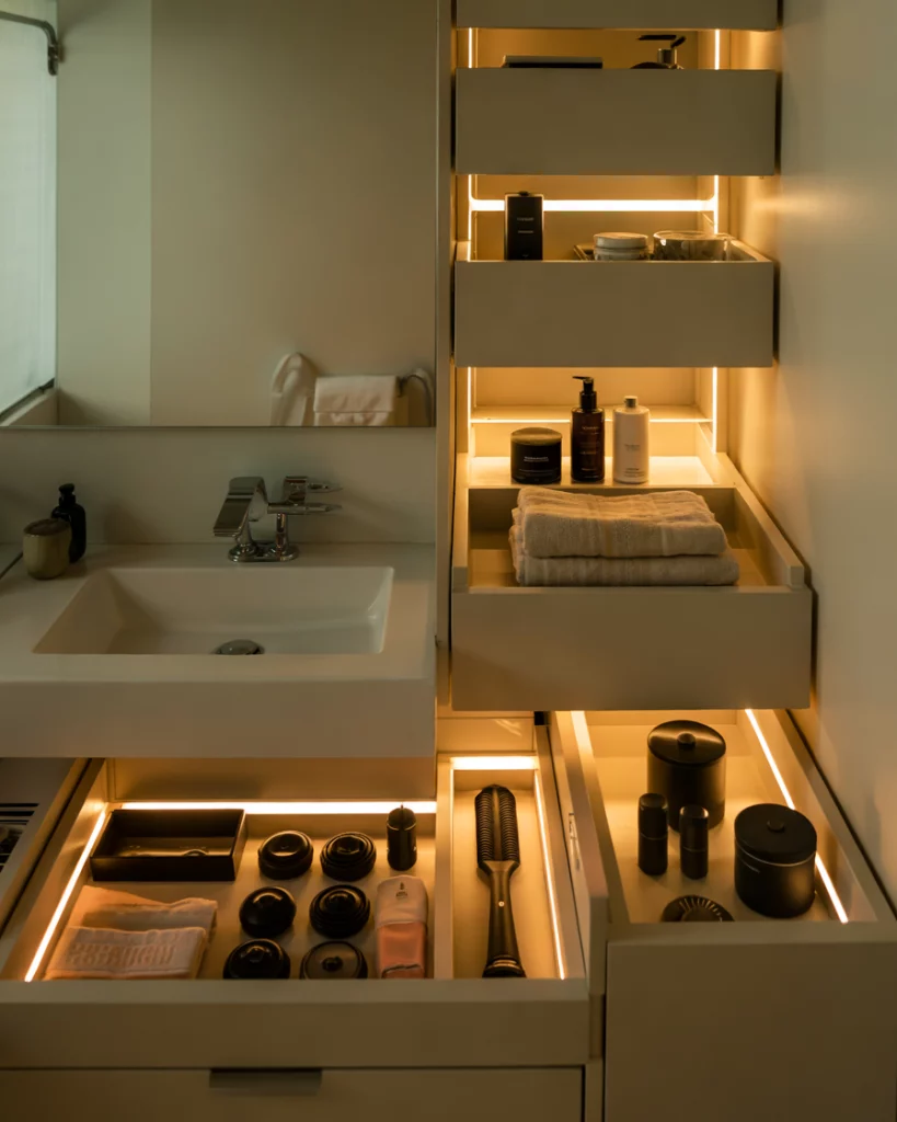 It is a fact that one can find some really innovative ideas for bathroom organization in 2026. Sensor-actuated lights in a drawer, a closet, and under a sink will ensure that you never need to rummage for stuff in the dark. Combine this minor tweak in a bathroom setup with a wireless charging station and a smart and innovative-looking makeup and skincare display for a luxurious effect. The examples given above display its luxury and innovative features.