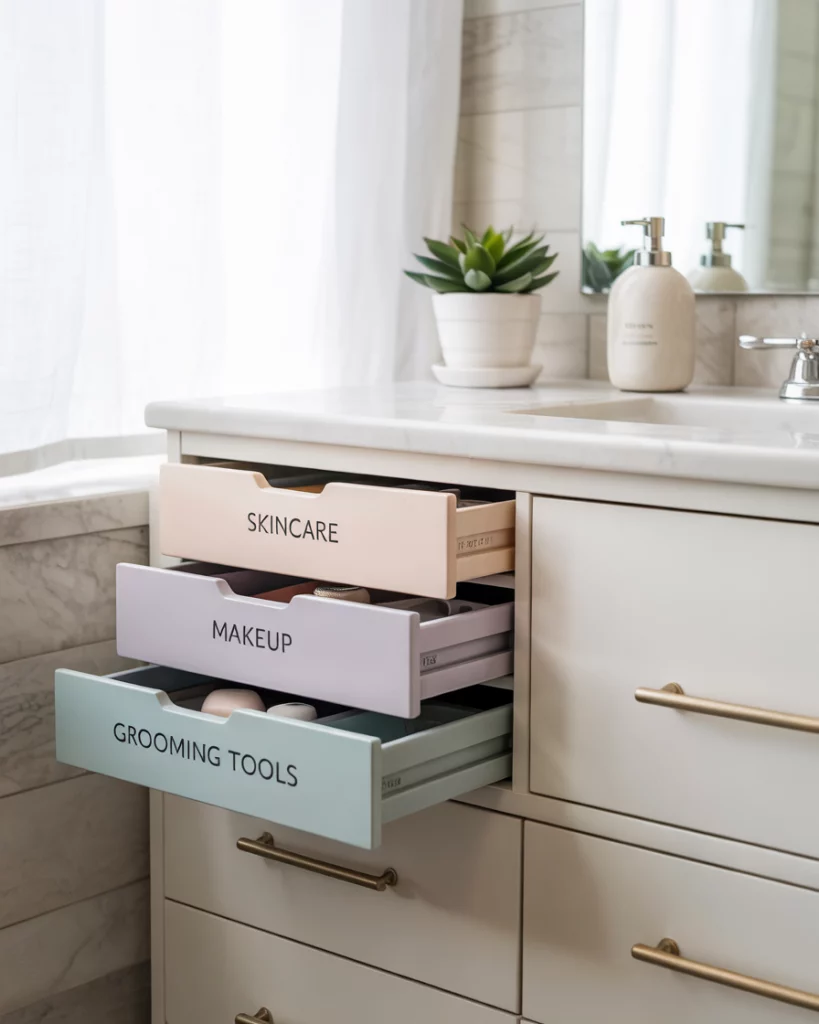 In 2026, labeling isn’t just functional—it’s part of the bathroom’s aesthetic. Use sleek engraved tags, waterproof vinyl stickers, or subtle color coding to identify each drawer’s contents—skincare, makeup, tools, or men’s grooming items. These ideas and drawer techniques keep everything visible and save time during busy mornings. A neutral color palette maintains sophistication, while pops of pastel bring charm to shared or guest spaces.
