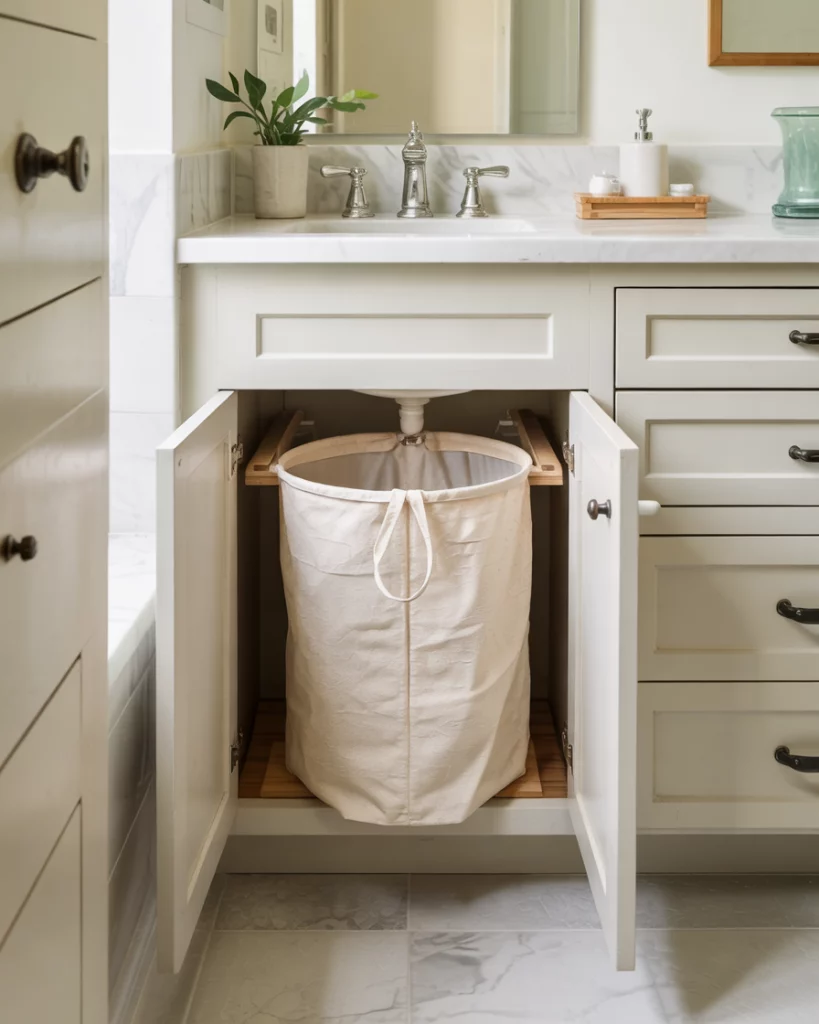 Laundry management often ruins the vibe of an organized bath. Built-in hampers tucked under the sink or behind faux panels are the new luxury standard. Choose removable cloth bags or slim bins from Dollar Tree for budget-friendly DIY setups. This idea suits tiny or apartment bathrooms where space is scarce. Add subtle ventilation holes and handles for convenience—proof that even practical solutions can match your aesthetic vision.