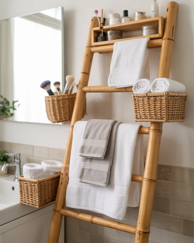 Every surface can multitask if styled right. Decorative ladders, woven baskets, or ottomans with compartments double as design and ideas storage. A bamboo ladder can hold towels while adding warmth to your small space. Combine this with clear jars for makeup or skincare, and you get both function and inspo for a cozy, curated look. These tips bring comfort and practicality together, ideal for shared or guest baths.