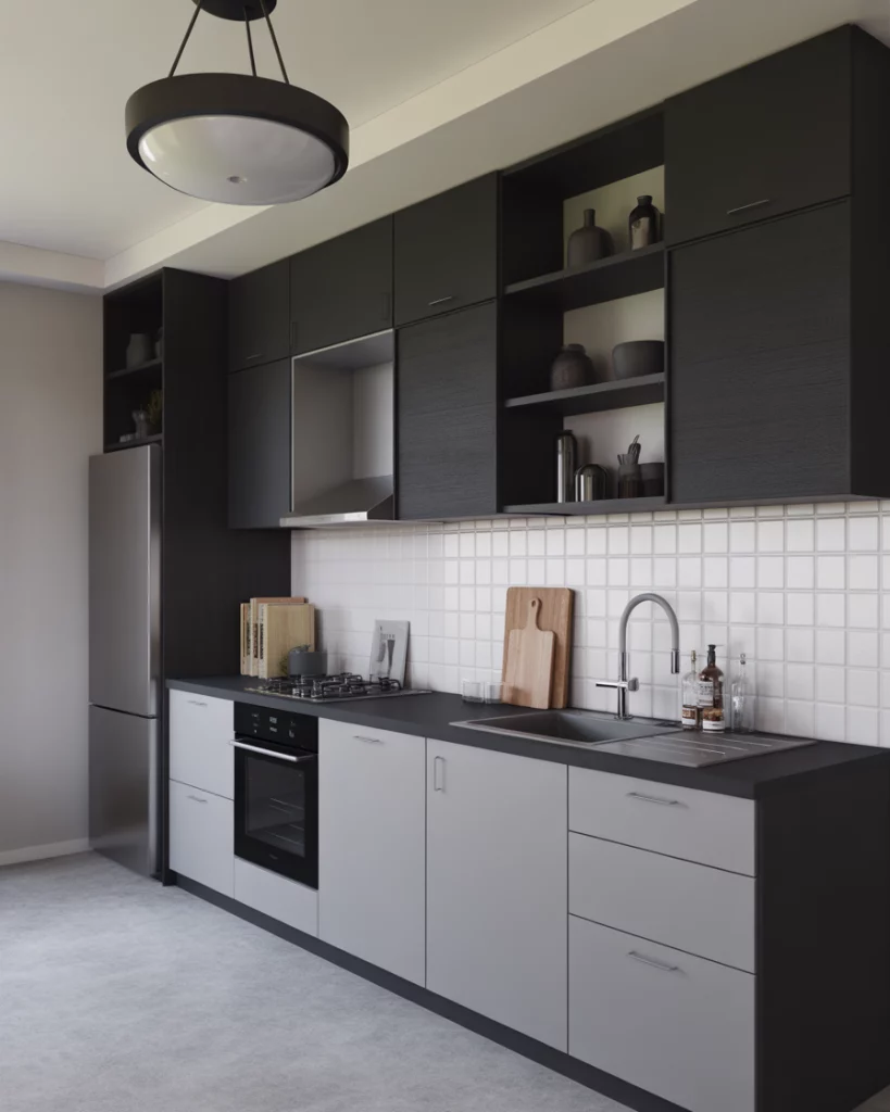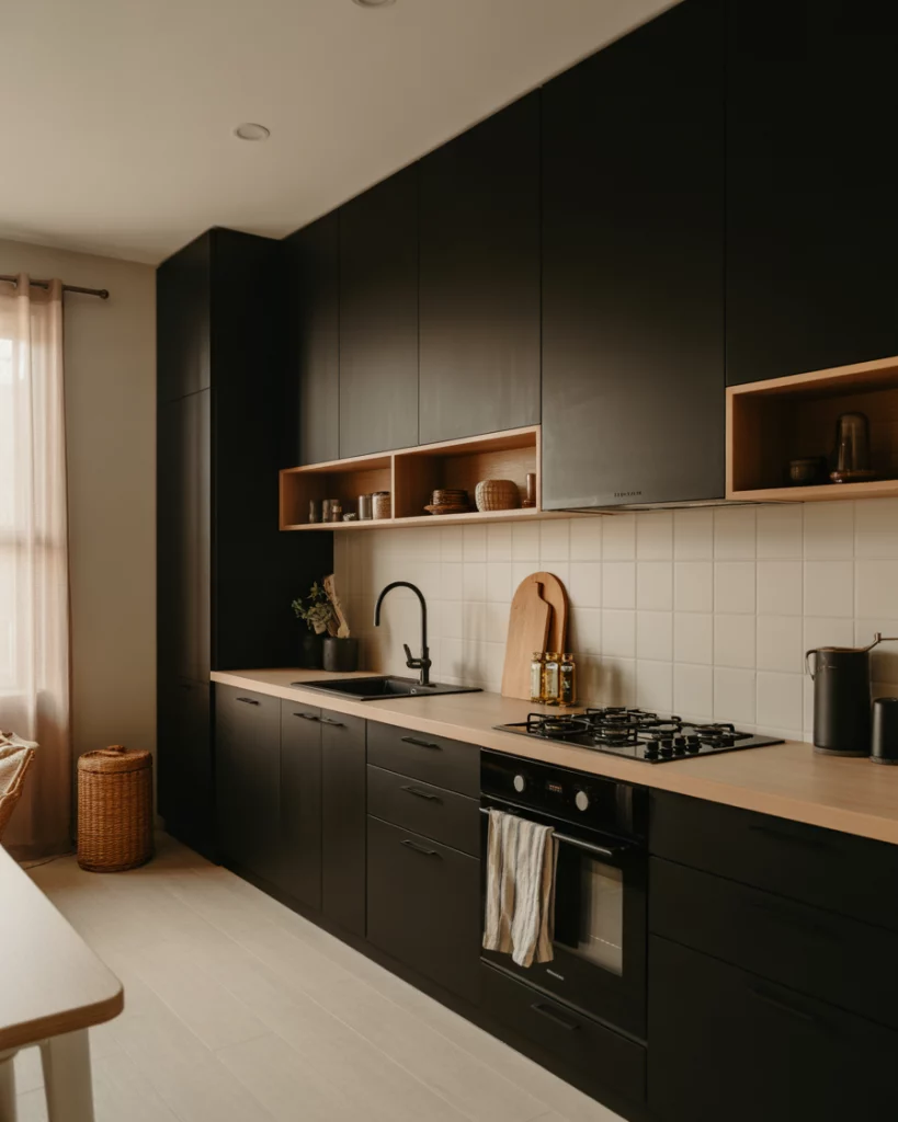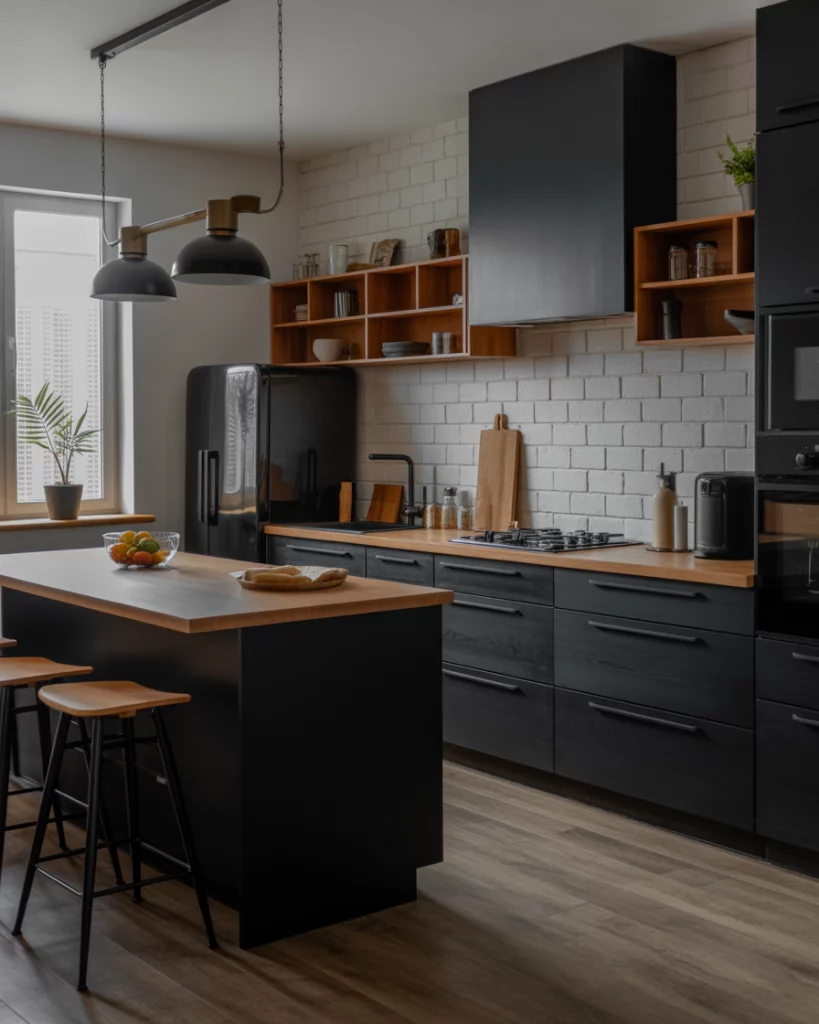 Black works even in small apartments if balanced with light accessories and reflective countertops. A compact island doubles as a table, making smart use of space. Pair with slimline appliances, a black sink, and light-toned hardware. The result is a functional design that feels chic without overwhelming the room.