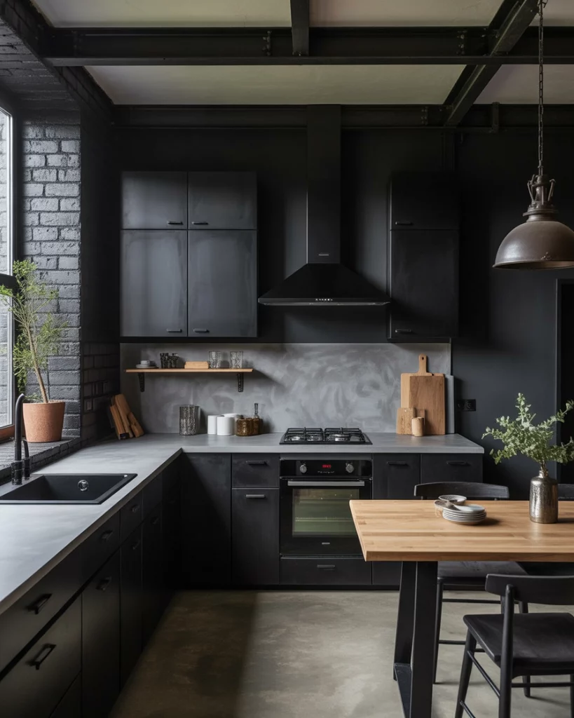 The industrial style is still thriving in 2026, and black fits right in. Pair black cabinets with concrete countertops, steel hardware, and exposed beams for an authentic urban vibe. A reclaimed wood countertop or rough-hewn table brings balance and warmth. This design works especially well in lofts or open spaces where raw details create character and bold aesthetic presence.