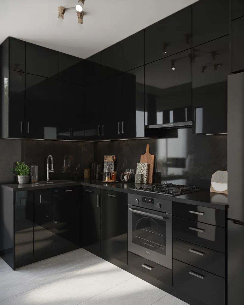 Not all black kitchens need to be matte. A high-gloss finish on cabinets and countertops delivers modern luxury. Reflective surfaces bounce light around, making a dark kitchen feel larger. Add chrome hardware and statement appliances to amplify the aesthetic. This look is ideal for all who love sleek, modern design.