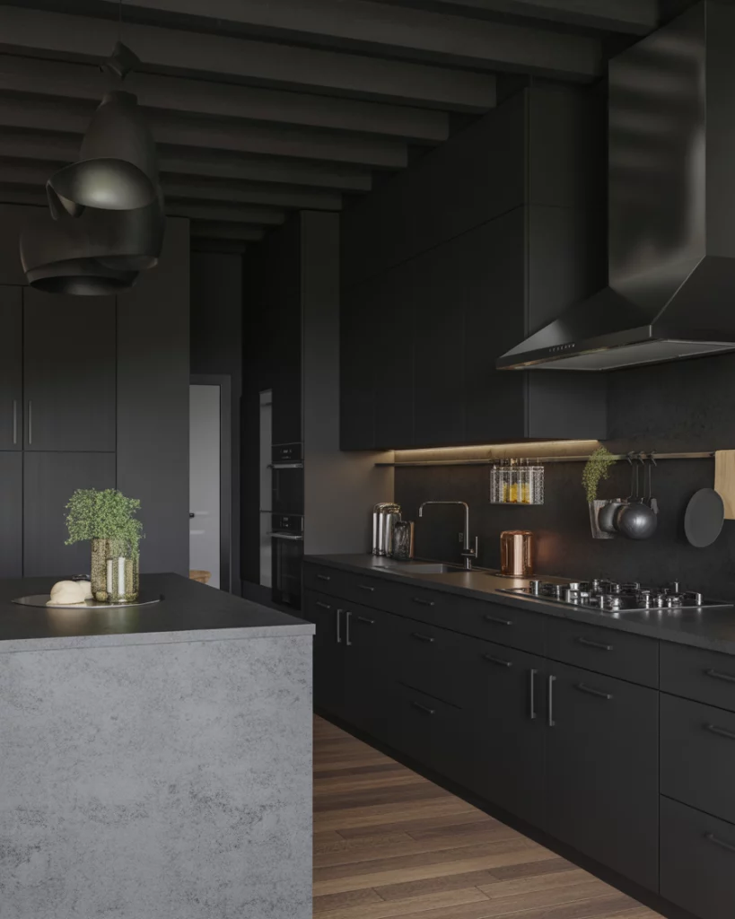 If you want drama without going full dark, grey and black is the perfect blend. Think smoky-toned cabinets ideas with matte black hardware and steel appliances for balance. This pairing offers design flexibility—modern, industrial, or even minimalist. A soft grey table or sink creates visual relief while enhancing the bold atmosphere of the black kitchen.