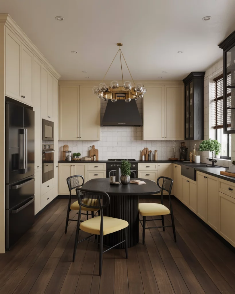 Balance bold black surfaces with softer textures for a more inviting aesthetic. Pair beige and black palettes, linen decor, and upholstered seating around a table or island. A wood and stone mix for countertops adds depth. Brass or matte hardware keeps the look polished. This design works beautifully for families who want elegance without losing comfort.